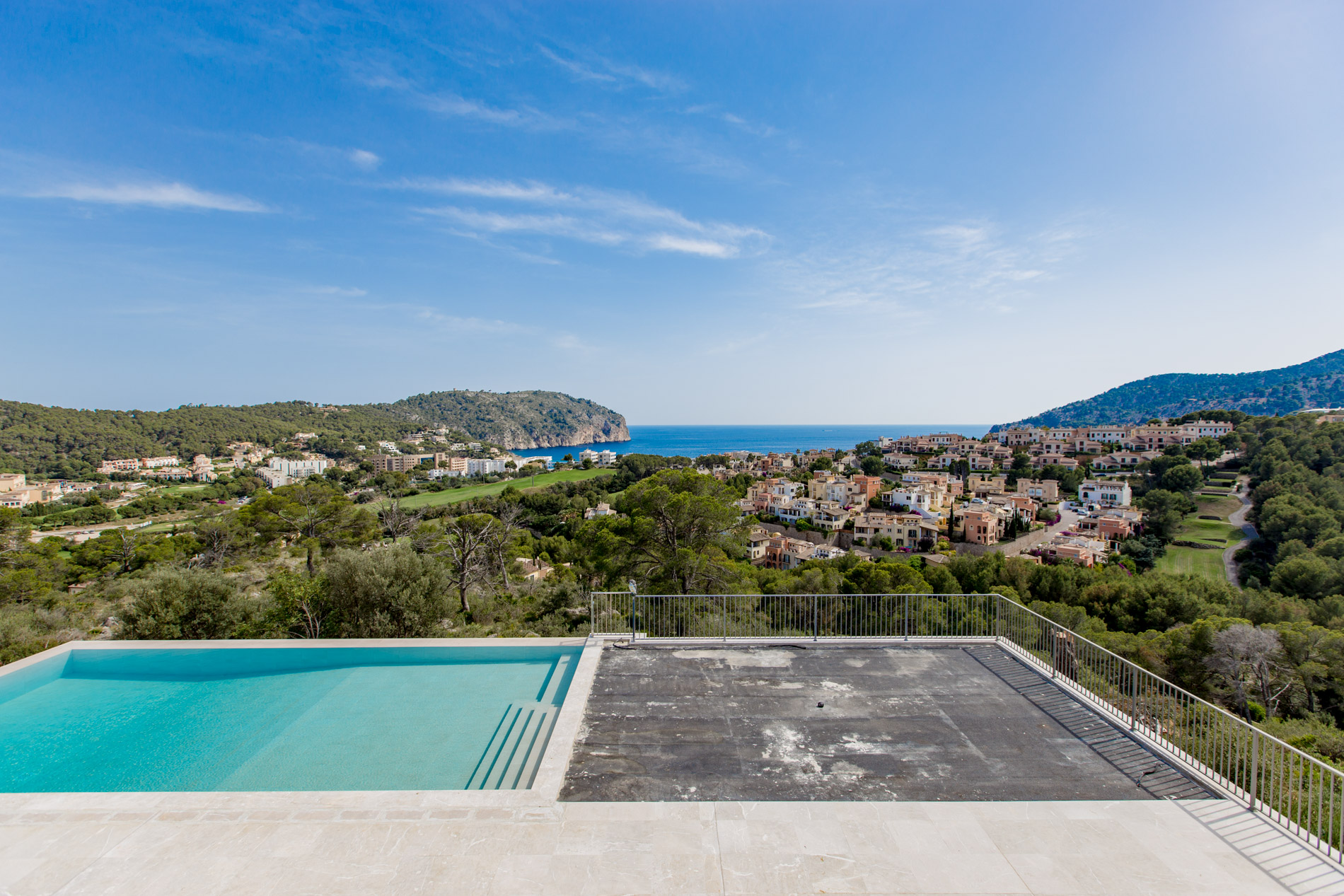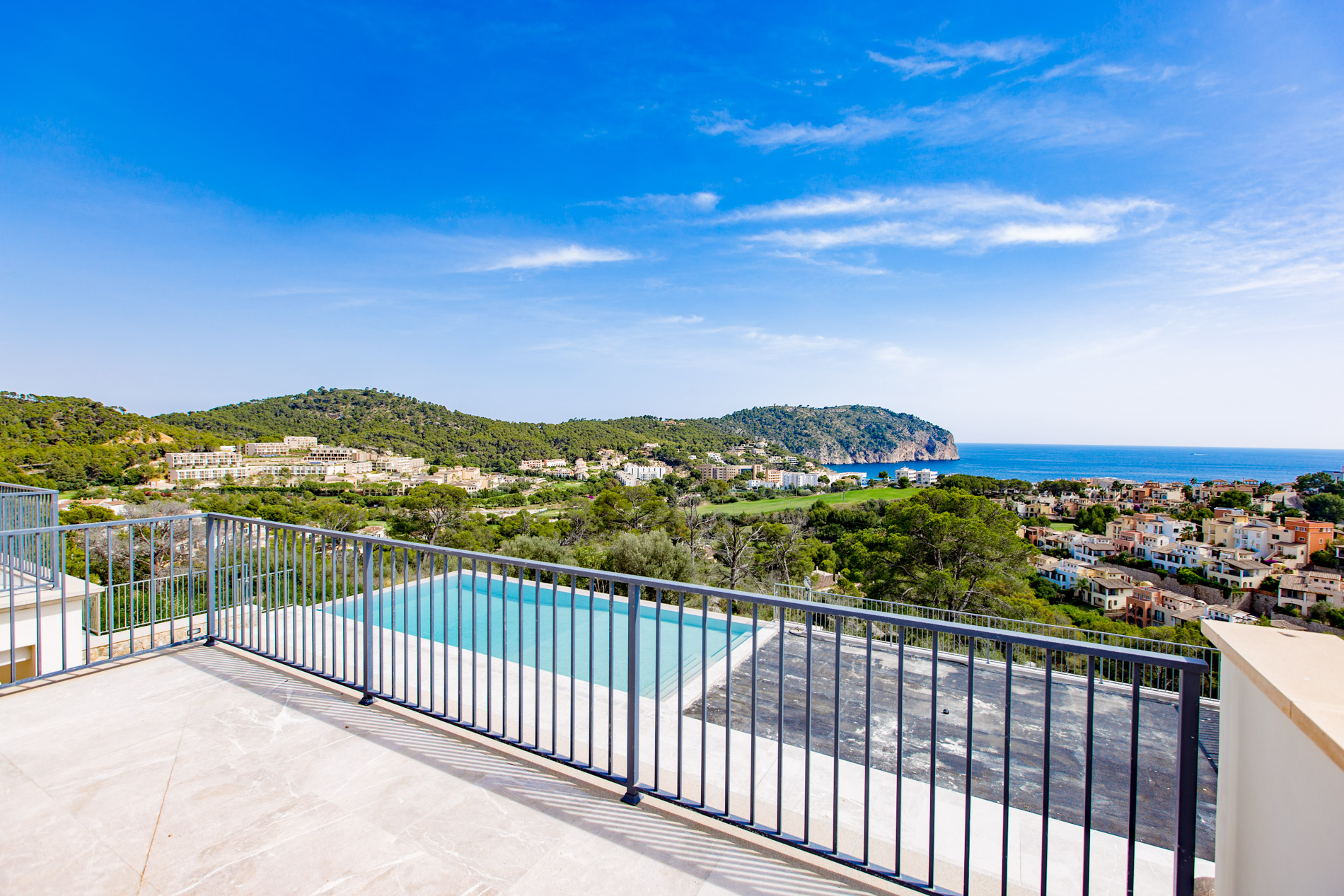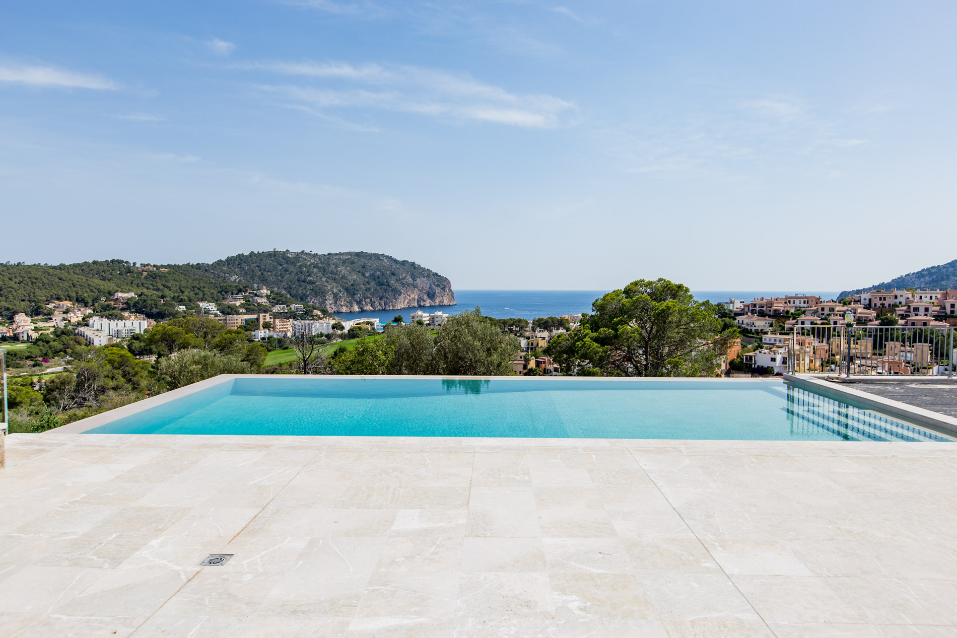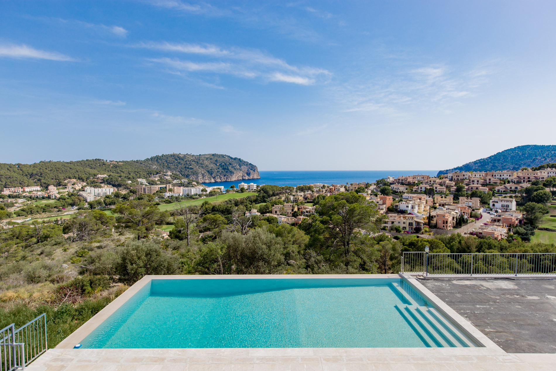 Dive into the Mediterranean charm with this spectacular estate in Camp de Mar. With a stately home offering panoramic views of the sea and mountains, this property is a true oasis of tranquility, accessible through a private road that harmoniously merges with the prestigious Andratx golf course.The ground floor welcomes you with a spacious hall that elegantly connects to the living room and dining area, while a modern kitchen and two bedrooms with en-suite bathrooms ensure comfort and luxury. Additionally, a guest bathroom adds a touch of practicality.Ascending to the first floor, you'll find an additional bedroom with an en-suite bathroom, as well as two master bedrooms offering walk-in closets and access to private terraces, where you can enjoy the infinite views of the surroundings.The basement houses a wellness sanctuary, with a gym equipped with a sauna to relax after a day of activity. Additionally, a service apartment, machinery room, and spacious garage complete this multifunctional area.The exterior is equally impressive, with an infinity pool surrounded by extensive sun-drenched terraces and lush gardens celebrating the region's native flora.And if that weren't enough, the nearby exclusive beach of Camp de Mar and its golf course await you just minutes away, while charming harbor cafes, restaurants, and boutiques are a short drive away.MallorcaSite, your real estate agency in Mallorca, recommends this property for its views, privacy and qualities.