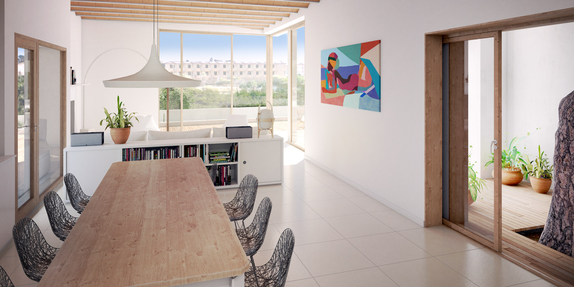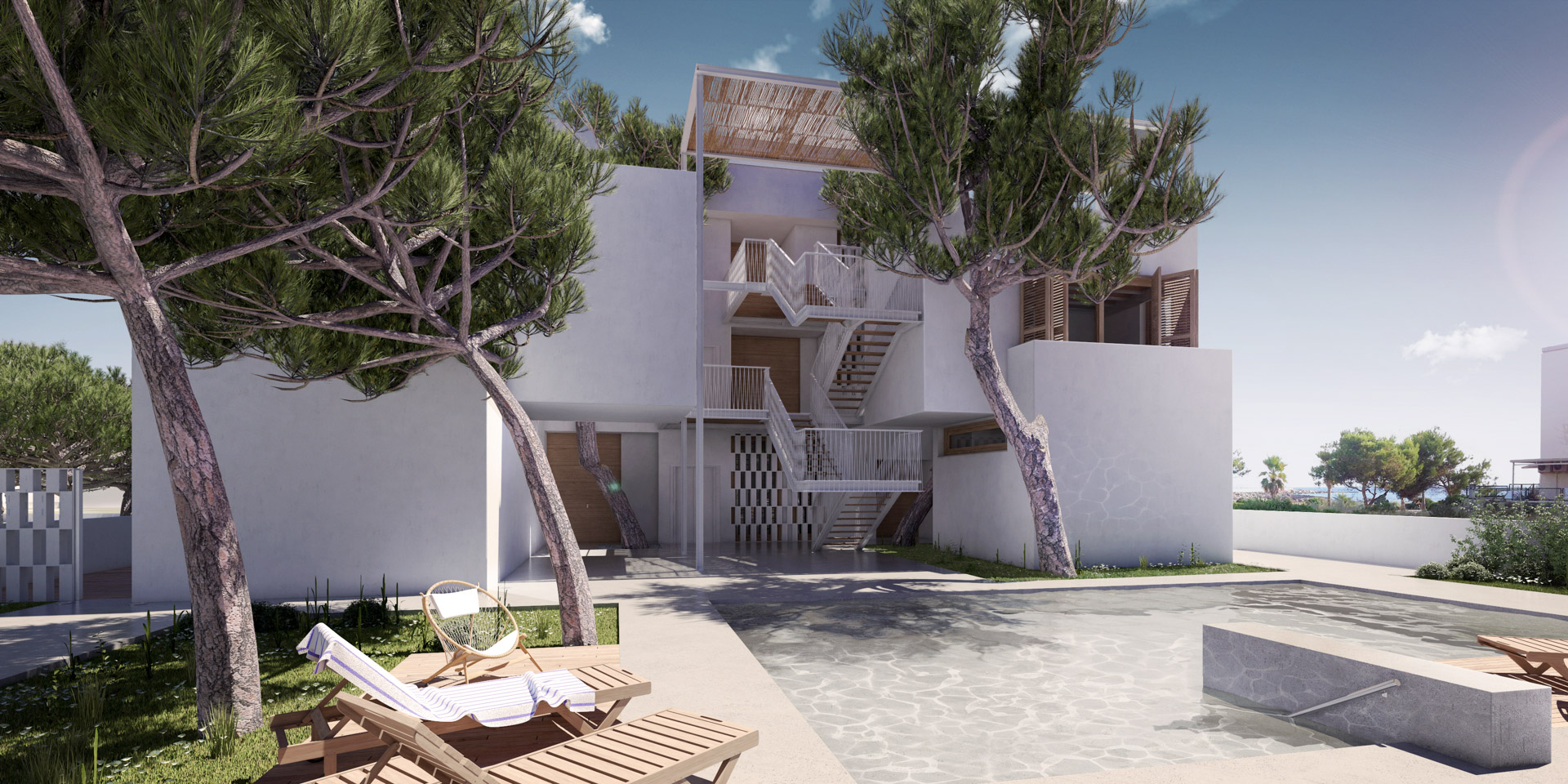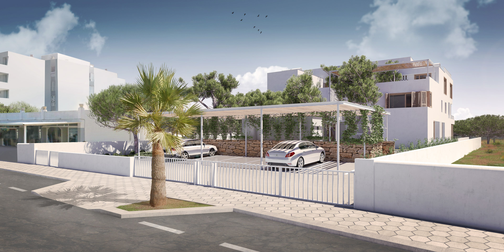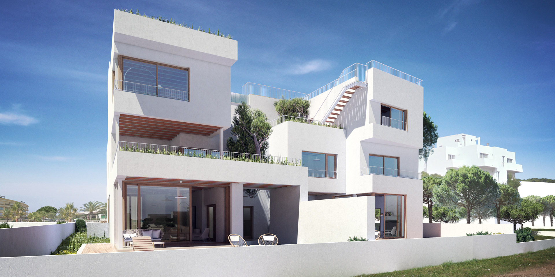 Modern architecture in perfect harmony with the natural environment of Colonia de Sant Jordi. An exclusive design project just 2 minutes from the beach of Es Trenc and the Mallorcan Salinas, 40 minutes from the airport and 50 minutes from the center of Palma.