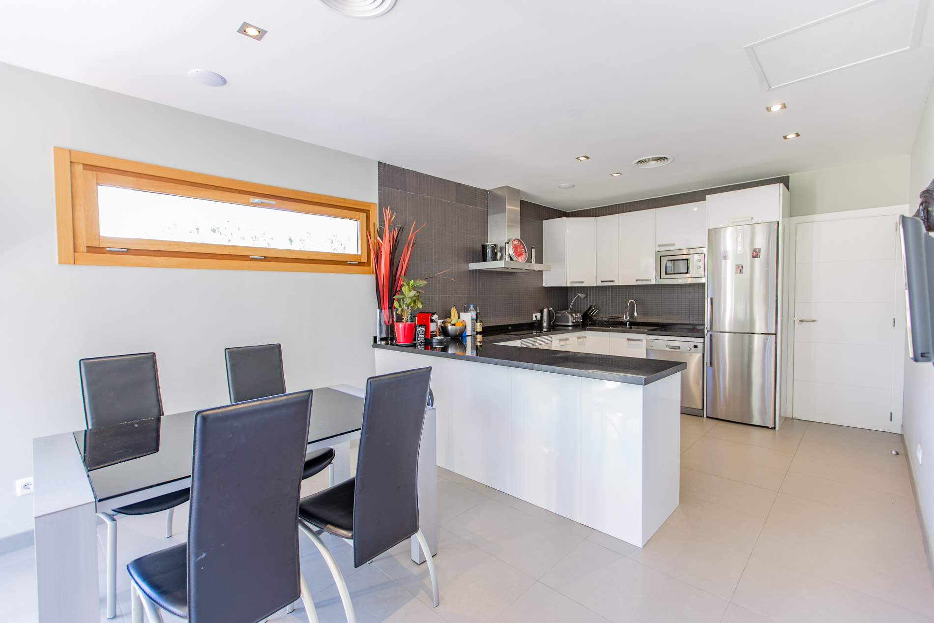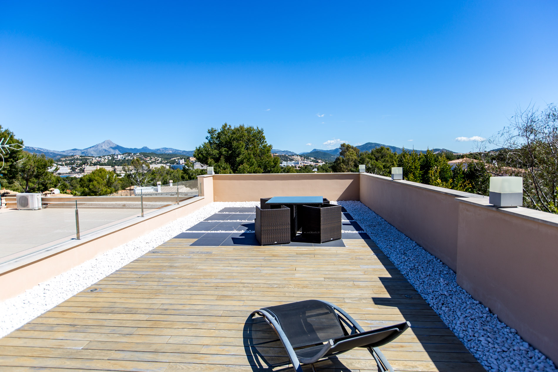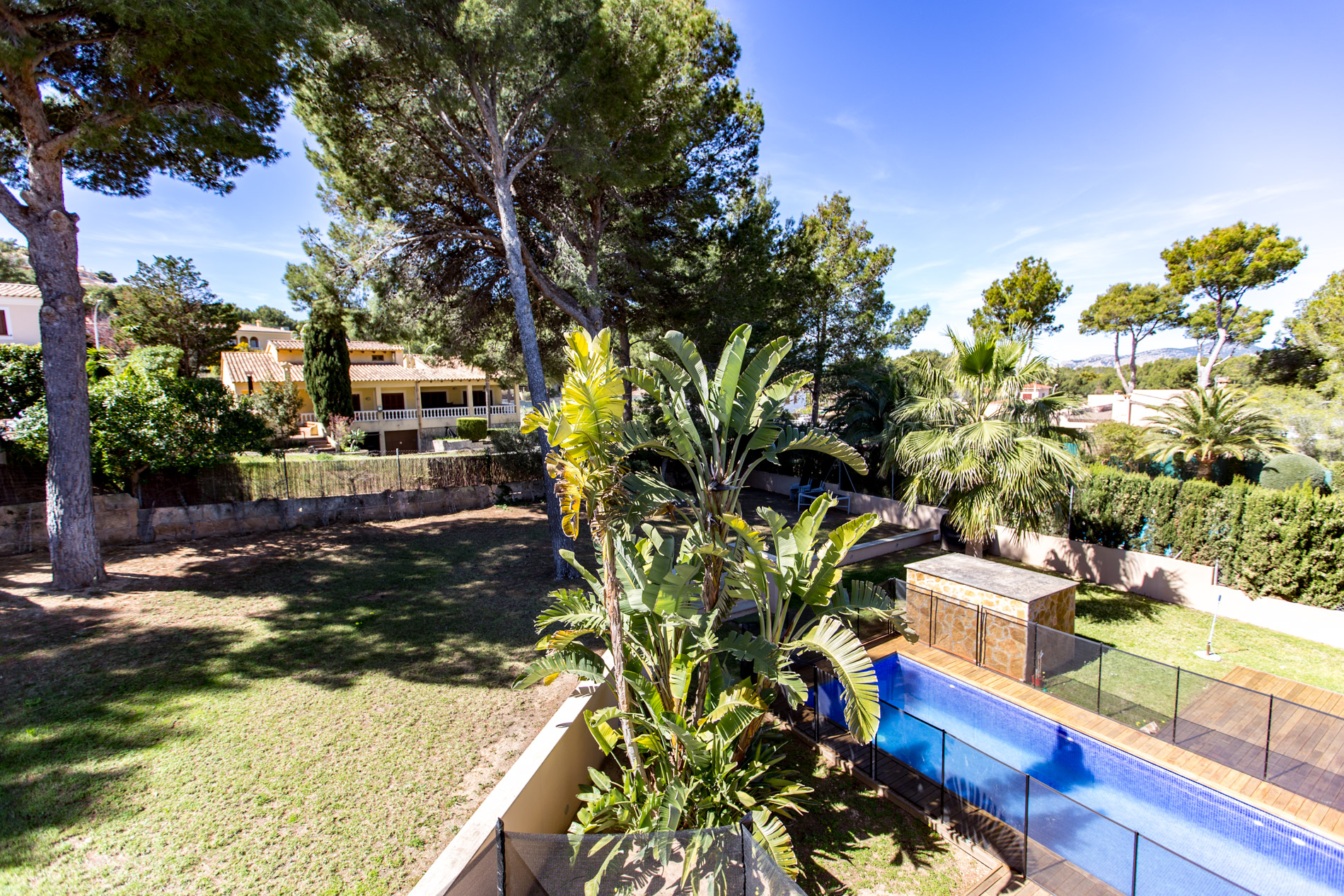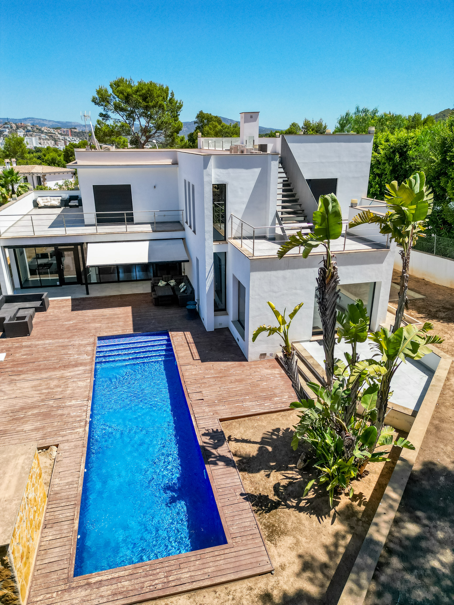 Se trata de una villa de estilo minimalista construida con materiales de alta gama, situada en una zona tranquila de Santa Ponsa con vistas a las montañas y ligeras al mar. Está situado en Santa Ponsa a 5 minutos de Port Adriano y de los campos de golf de Santa Ponsa., a 18 Km. de Palma En la planta baja se encuentra el recibidor que divide la vivienda en 3 zonas: a mano derecha se encuentra el salón-comedor con acceso a un bonita terraza que da al jardín y a la piscina. Tras el salón hay una gran cocina equipada con coladuría y acceso directo exterior. A mano izquierda del recibidor, se encuentra el garaje para 2 vehículos. Y en frente del recibidor, nos encontramos con un pasillo que da a los 3 dormitorios y 3 baños. En la planta piso se encuentra a un lado el dormitorio principal con vestidor, baño en suite y acceso a una amplia terraza y al otro lado un bar con sala de cine ideal para fiestas y un dormitorio con baño para invitados con acceso a una terraza. MallorcaSite, su agencia inmobiliaria le recomienda esta propiedad por su diseño, por su amplitud, por su ubicación.