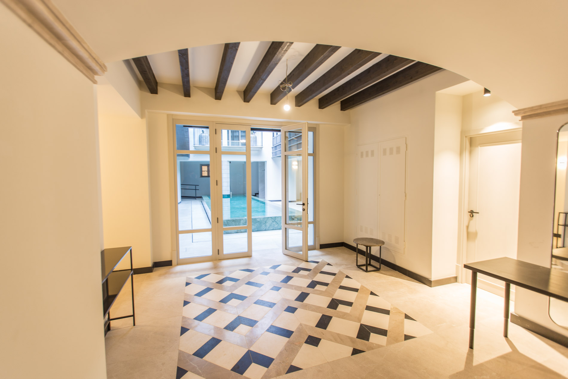 Este ático se encuentra en un edificio situado en el centro del casco antiguo de Palma, junto a la zona de galerías de arte, cafeterías, restaurantes, a tan sólo 3 minutos del paseo del Borne, de Jaime III y 5 minutos del paseo marítimo y a tan sólo 10 minutos del aeropuerto. El edificio cuenta con un bonito jardín con piscina con únicamente 10 vecinos la mayoría con terraza, ideal para disfrutar de la luz y a la vez tranquilidad que ofrece el casco antiguo de la ciudad. A destacar el concepto comunitario con piscina central y apartamento de invitados para el deleite de todos los vecinos. Todos los apartamentos cuentan con aspectos individualizados, en la primera planta los pisos cuentan con techos altos. Todos los dormitorios son amplios y están en consonancia con la estética de la vivienda, con una mezcla de madera y colores suaves. Estos espacios se caracterizan por su comodidad y ambiente acogedor. Los baños se crean con un estilo moderno pensando en cada rincón para optimizar el espacio. La cocina y el salón se funden en un espacio social moderno, orientado hacia el interior con grandes ventanales que dan al jardín, la piscina o la calle. Los pisos cuentan con altos techos y vigas restauradas que le dan un carácter especial a este edificio histórico. Un contraste suave lo recorre todo, con colores cálidos para crear una atmósfera comfortable. La cocina de la marca Varenna es ultra moderna y minimalista con electrodomésticos Gaggenau. Este piso cuenta con una terraza privada de 40 m2. MallorcaSite, su agencia inmobiliaria en Mallorca, le recomienda esta propiedad por su estilo, diseño, ubicación, encanto.