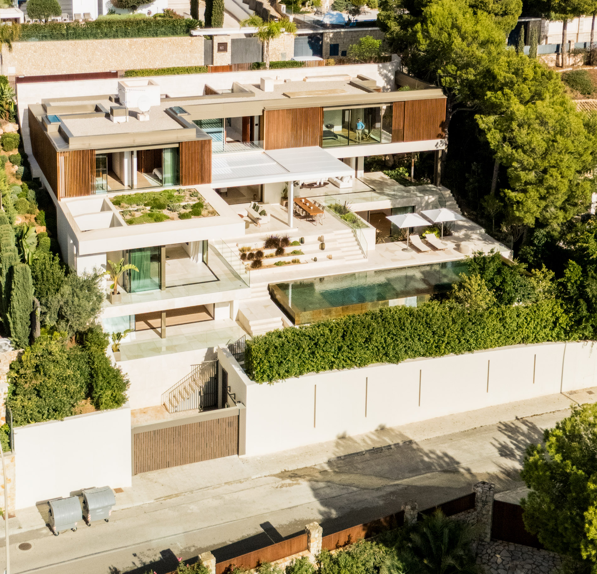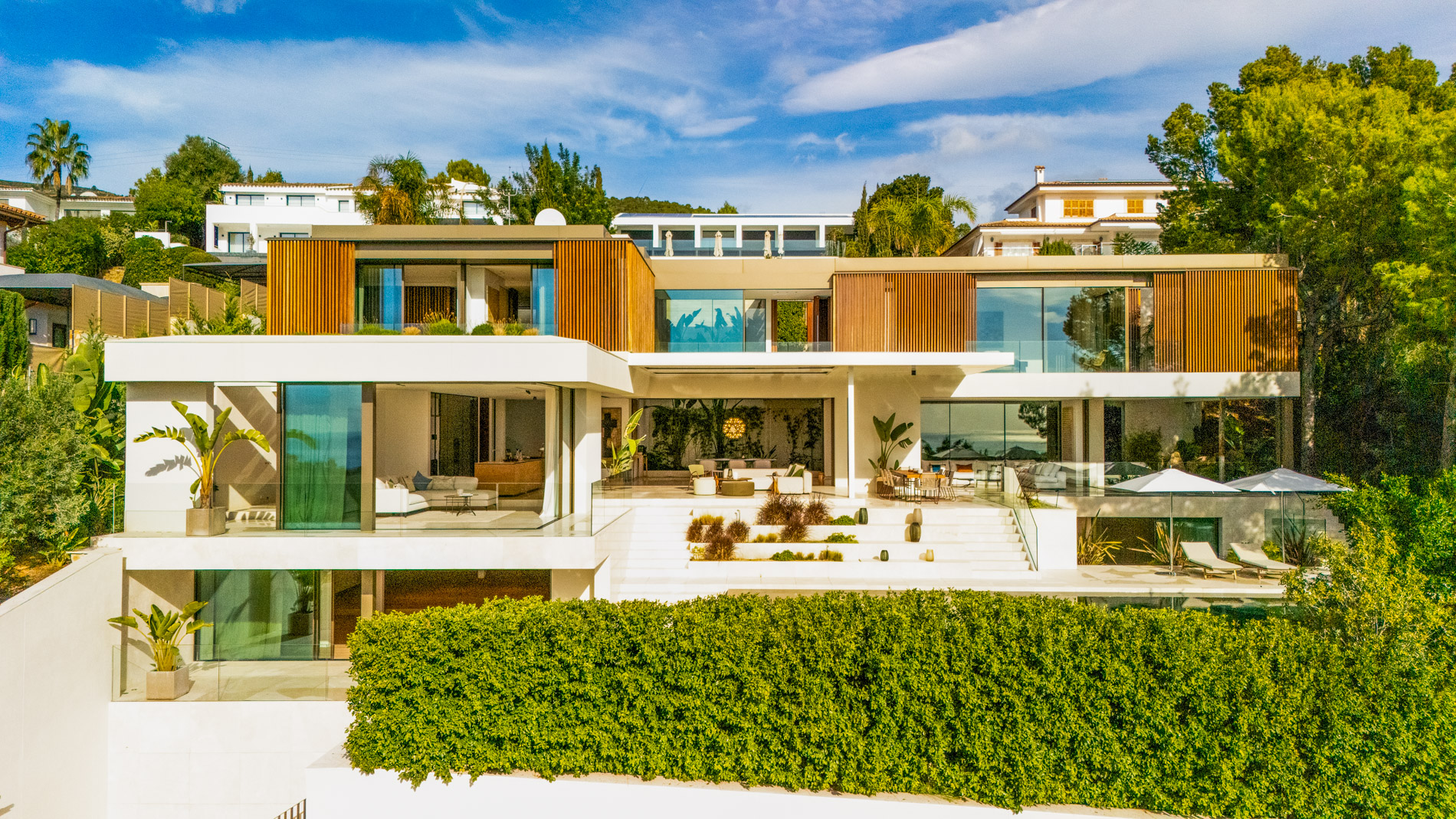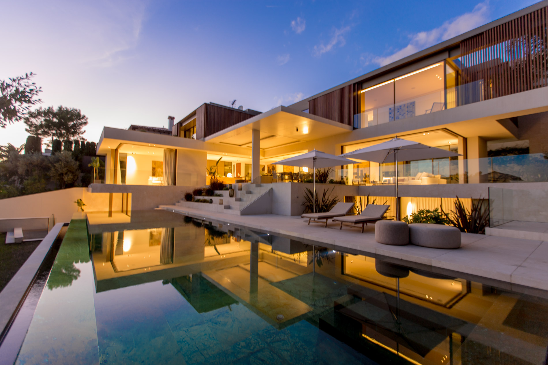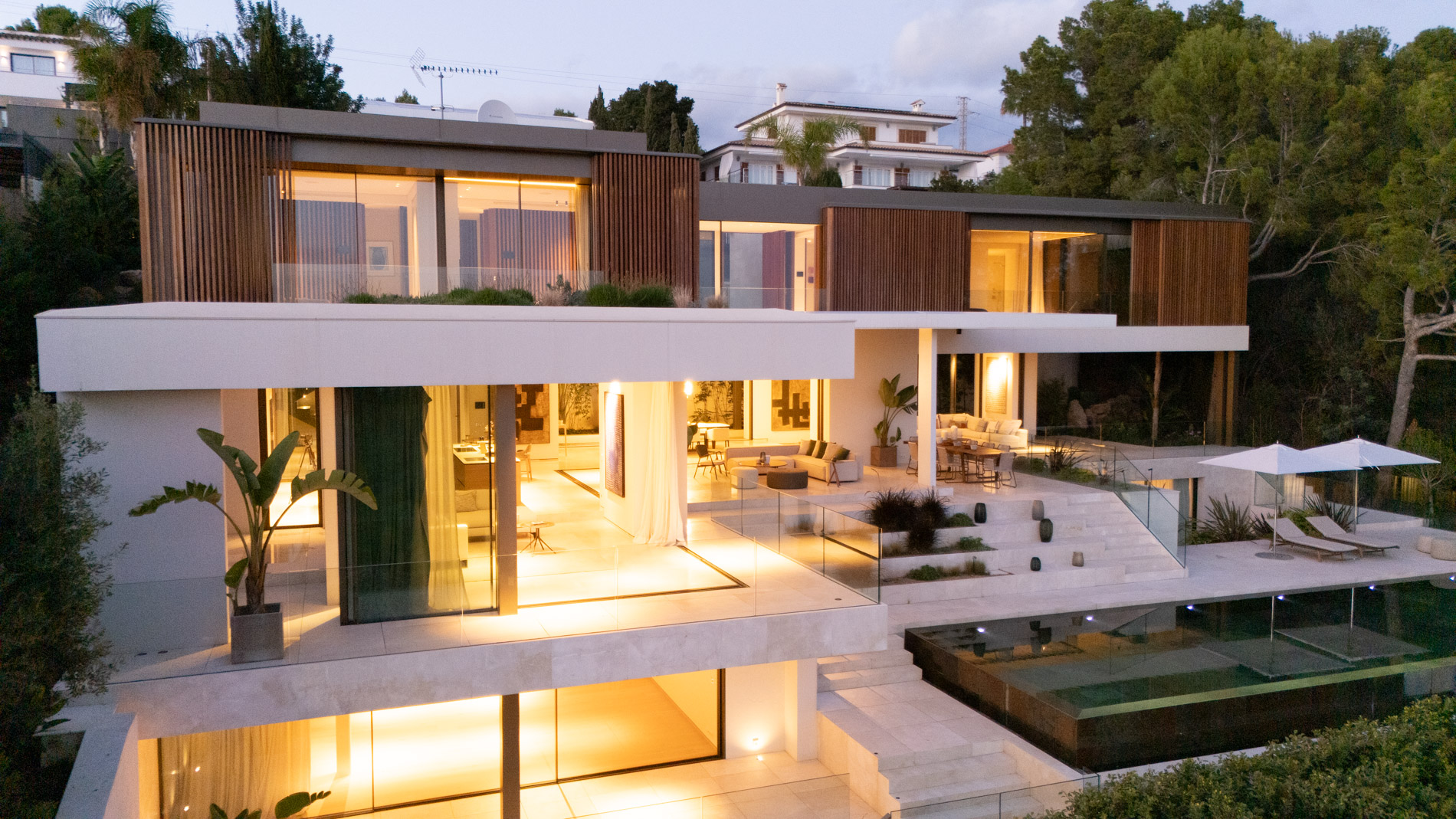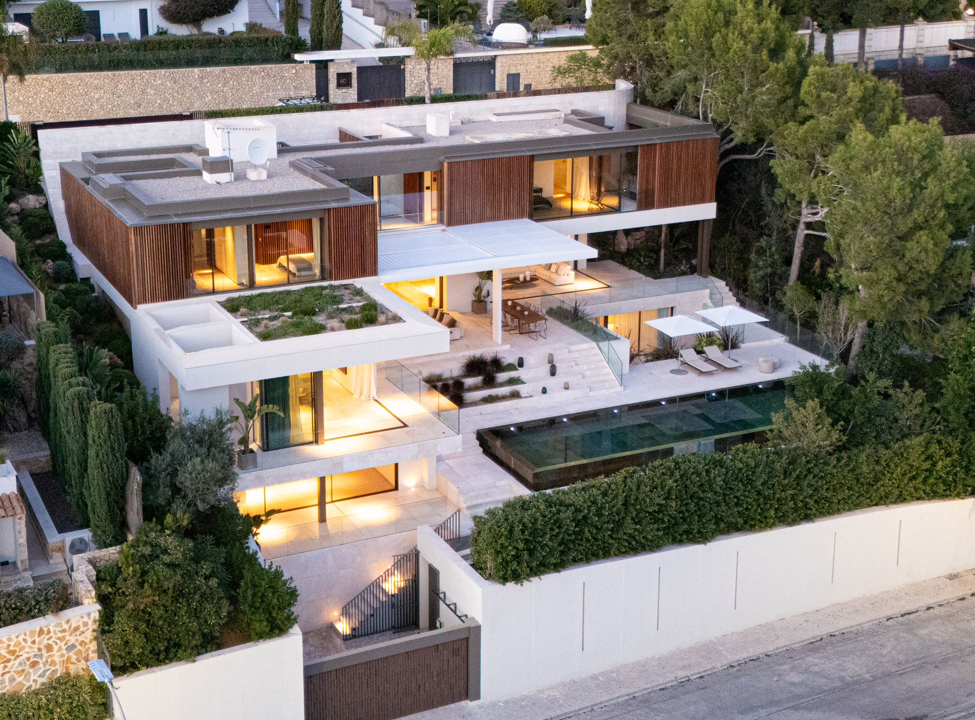 Esta villa es una auténtica obra de arte arquitectónica, diseñada con un nivel de detalle excepcional para resaltar las impresionantes vistas que la rodean. Su concepto vanguardista, desarrollado por un equipo internacional, fusiona materiales naturales de la isla con un entorno de ensueño, creando una propiedad única e inigualable. Distribuida en tres niveles, la villa cuenta con un nivel principal que alberga tres dormitorios, entre ellos una amplia y elegante suite principal con vistas al mar. Para el disfrute de los invitados, dos junior suites adicionales se encuentran en el nivel de la piscina, donde también se ubican una lujosa zona de spa y bienestar y un espacioso gimnasio. El nivel de vida, con su magnífica terraza al aire libre, es otro de los puntos culminantes de esta propiedad. Además de una sala de estar con comedor formal, la villa incluye una amplia y lujosa cocina Poliform con una sala contigua. Un elaborado sistema de iluminación aporta la atmósfera perfecta para cada ocasión. Con grandes ventanales minimalistas de Panoramah!, techos altos, y suelos de piedra natural y parquet de madera de alta calidad en las zonas de descanso, la villa se presenta como un espacio de lujo y confort incomparables. Su sistema domótico, de uso intuitivo y accesible desde cualquier dispositivo móvil, permite un control total del hogar. Las amplias zonas de aparcamiento están preparadas con estaciones de carga para vehículos eléctricos, ofreciendo todas las comodidades de una propiedad moderna y sostenible. Rodeada de exuberantes plantas tropicales y mediterráneas que complementan su diseño galardonado, esta villa es el epítome de la elegancia y el confort. MallorcaSite, su agencia inmobiliaria de confianza en Mallorca, recomienda esta propiedad por su diseño impecable, sus vistas espectaculares y la calidad excepcional de sus materiales.