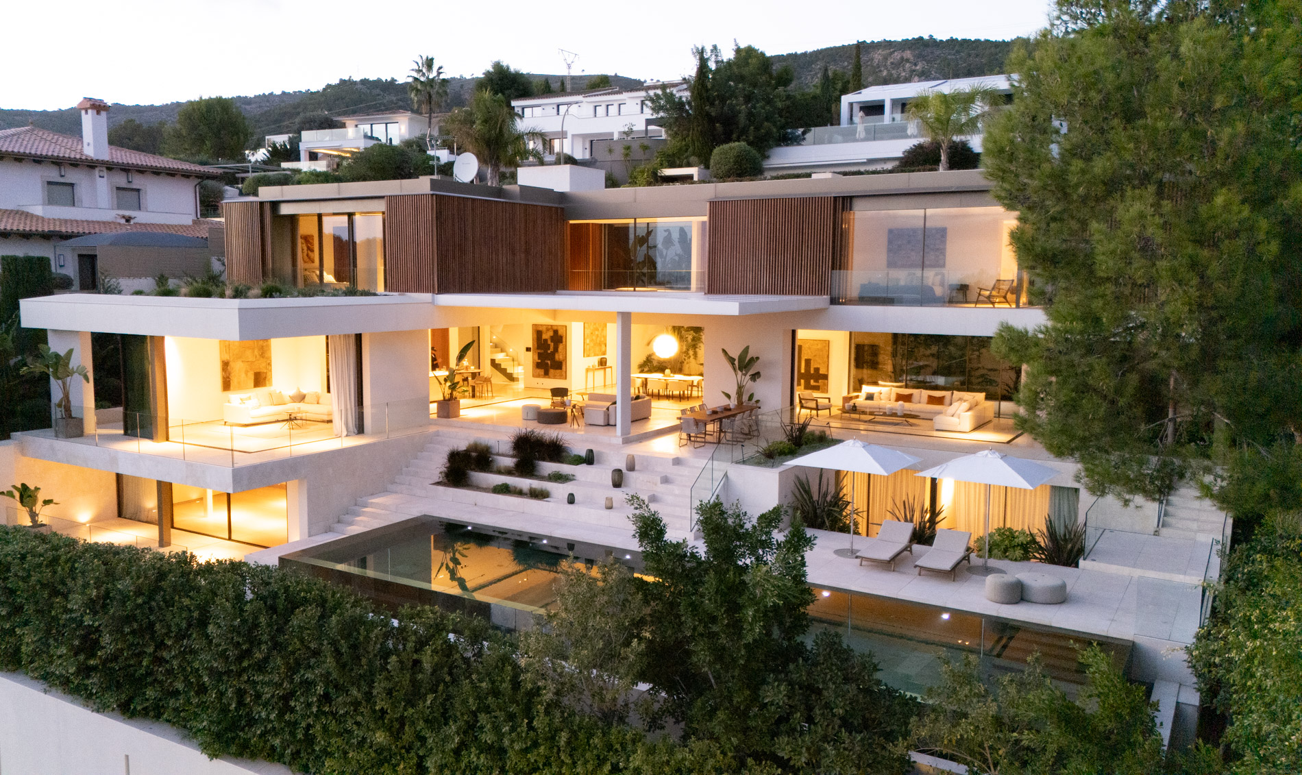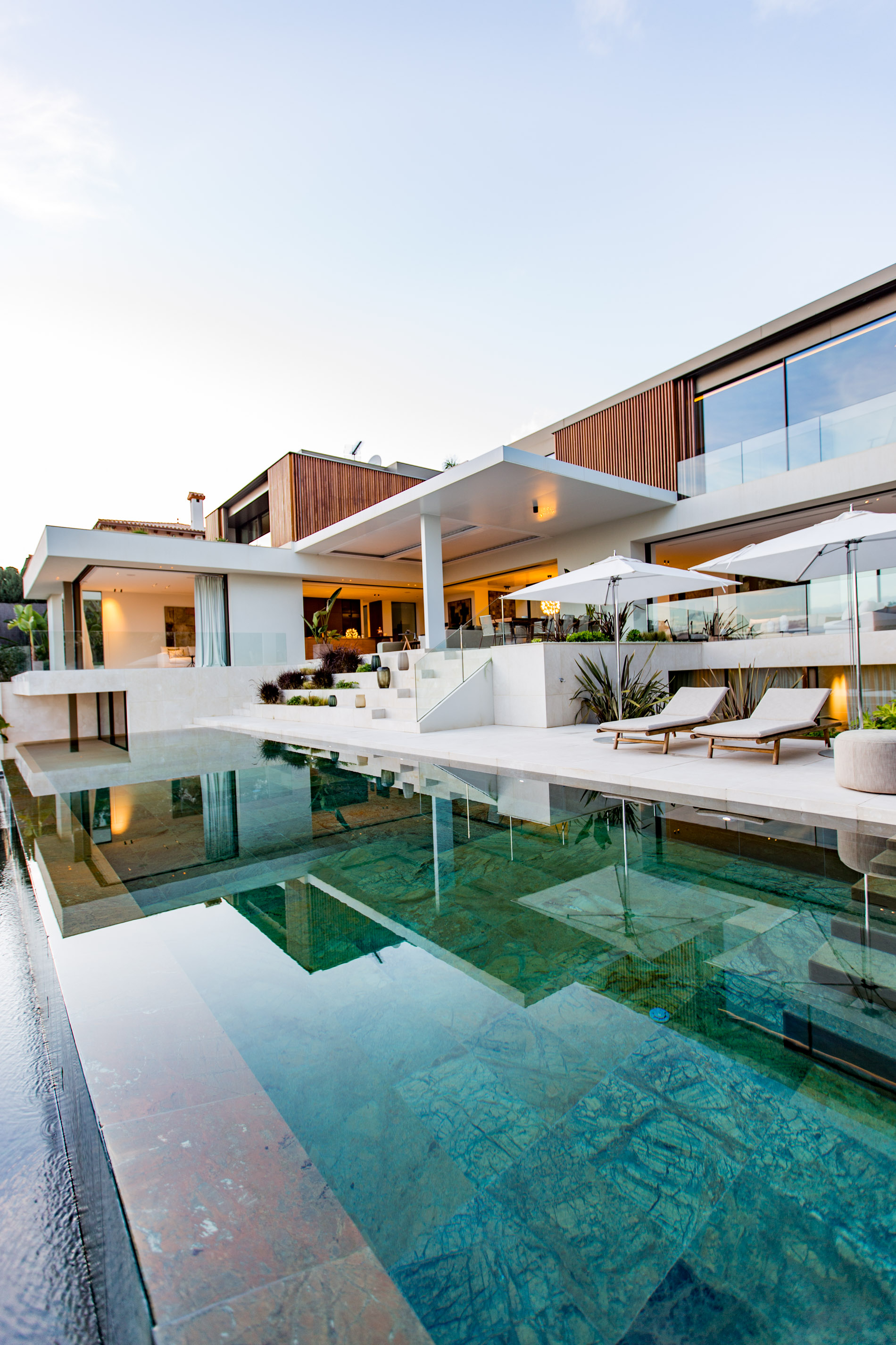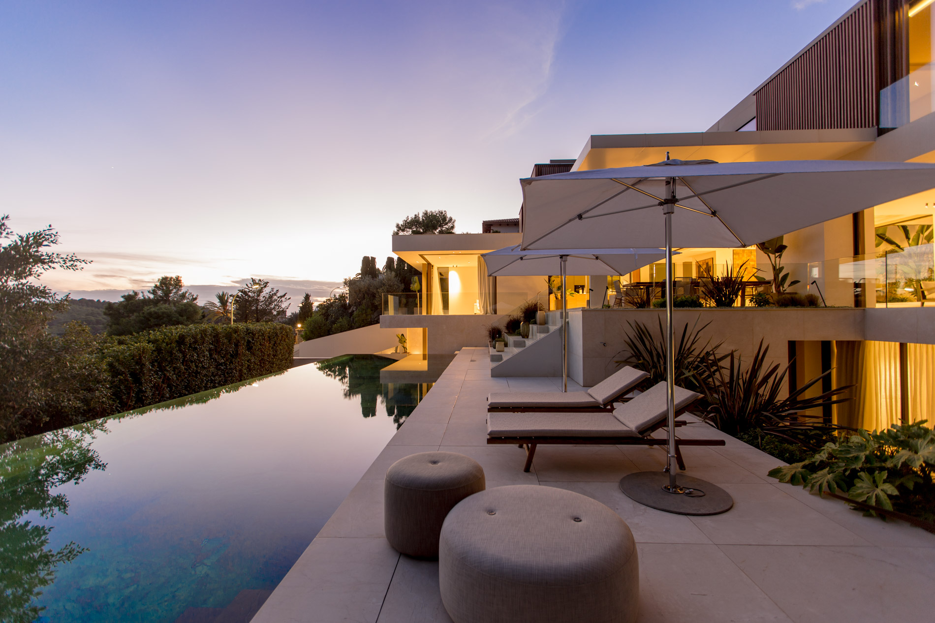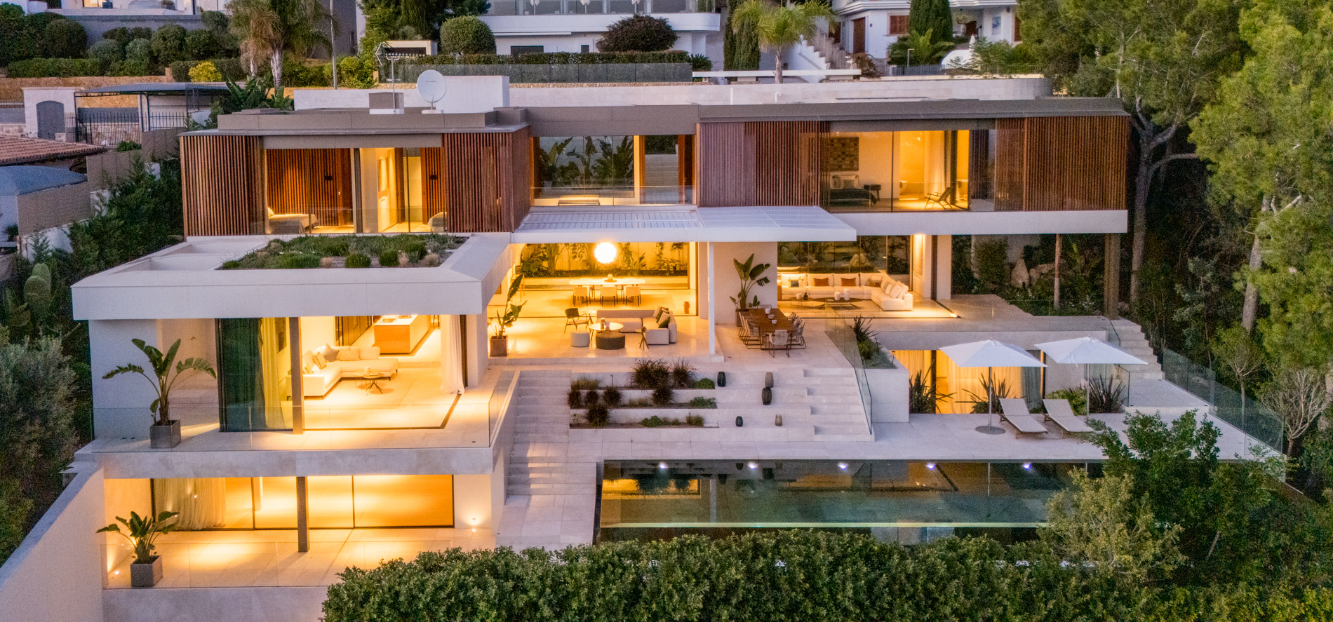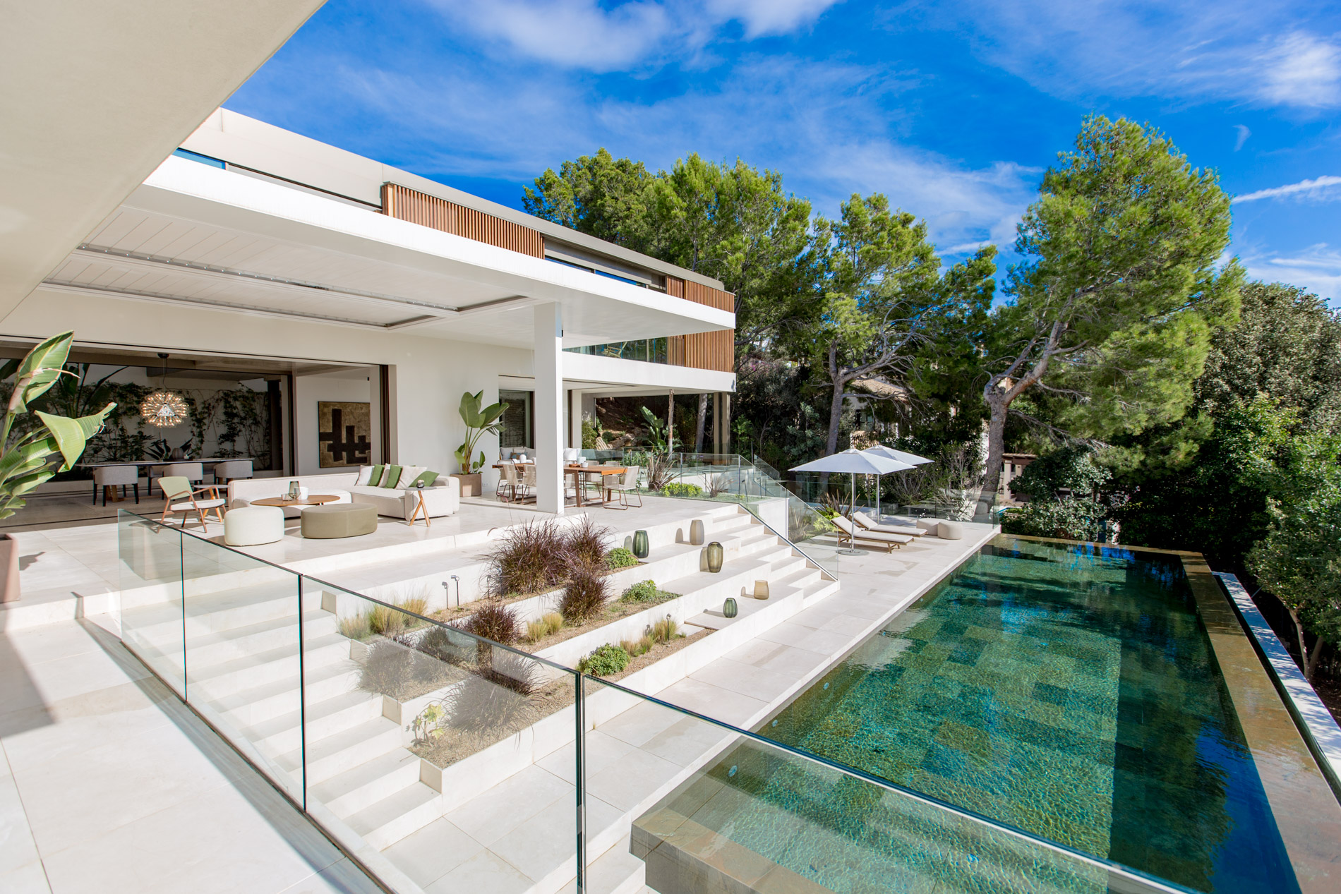 Esta villa es una auténtica obra de arte arquitectónica, diseñada con un nivel de detalle excepcional para resaltar las impresionantes vistas que la rodean. Su concepto vanguardista, desarrollado por un equipo internacional, fusiona materiales naturales de la isla con un entorno de ensueño, creando una propiedad única e inigualable. Distribuida en tres niveles, la villa cuenta con un nivel principal que alberga tres dormitorios, entre ellos una amplia y elegante suite principal con vistas al mar. Para el disfrute de los invitados, dos junior suites adicionales se encuentran en el nivel de la piscina, donde también se ubican una lujosa zona de spa y bienestar y un espacioso gimnasio. El nivel de vida, con su magnífica terraza al aire libre, es otro de los puntos culminantes de esta propiedad. Además de una sala de estar con comedor formal, la villa incluye una amplia y lujosa cocina Poliform con una sala contigua. Un elaborado sistema de iluminación aporta la atmósfera perfecta para cada ocasión. Con grandes ventanales minimalistas de Panoramah!, techos altos, y suelos de piedra natural y parquet de madera de alta calidad en las zonas de descanso, la villa se presenta como un espacio de lujo y confort incomparables. Su sistema domótico, de uso intuitivo y accesible desde cualquier dispositivo móvil, permite un control total del hogar. Las amplias zonas de aparcamiento están preparadas con estaciones de carga para vehículos eléctricos, ofreciendo todas las comodidades de una propiedad moderna y sostenible. Rodeada de exuberantes plantas tropicales y mediterráneas que complementan su diseño galardonado, esta villa es el epítome de la elegancia y el confort. MallorcaSite, su agencia inmobiliaria de confianza en Mallorca, recomienda esta propiedad por su diseño impecable, sus vistas espectaculares y la calidad excepcional de sus materiales.