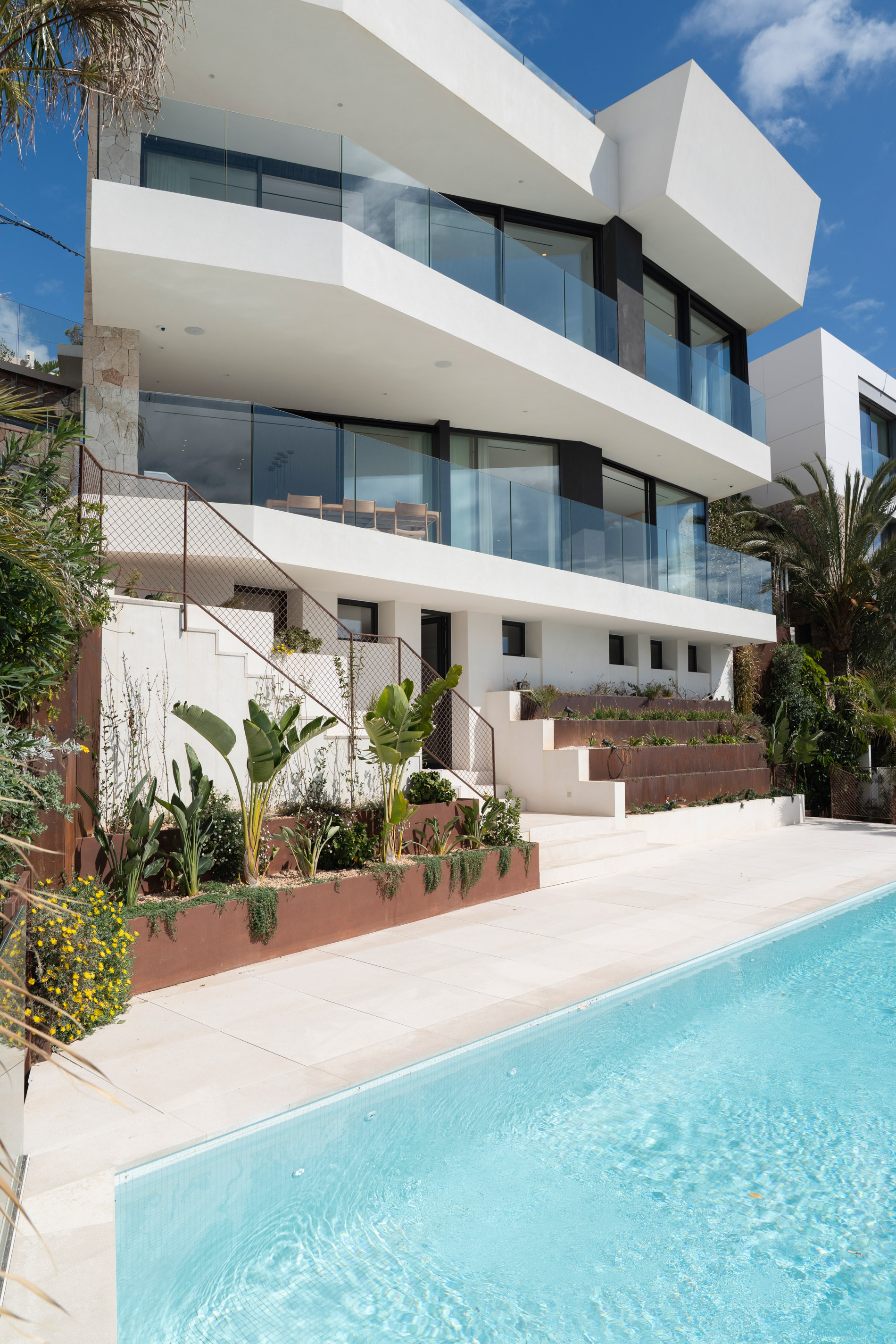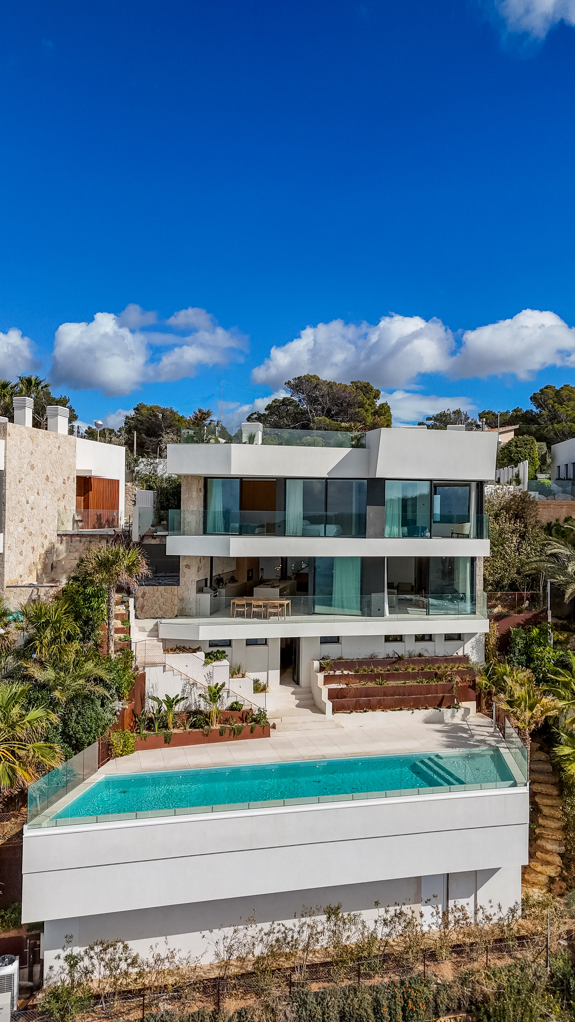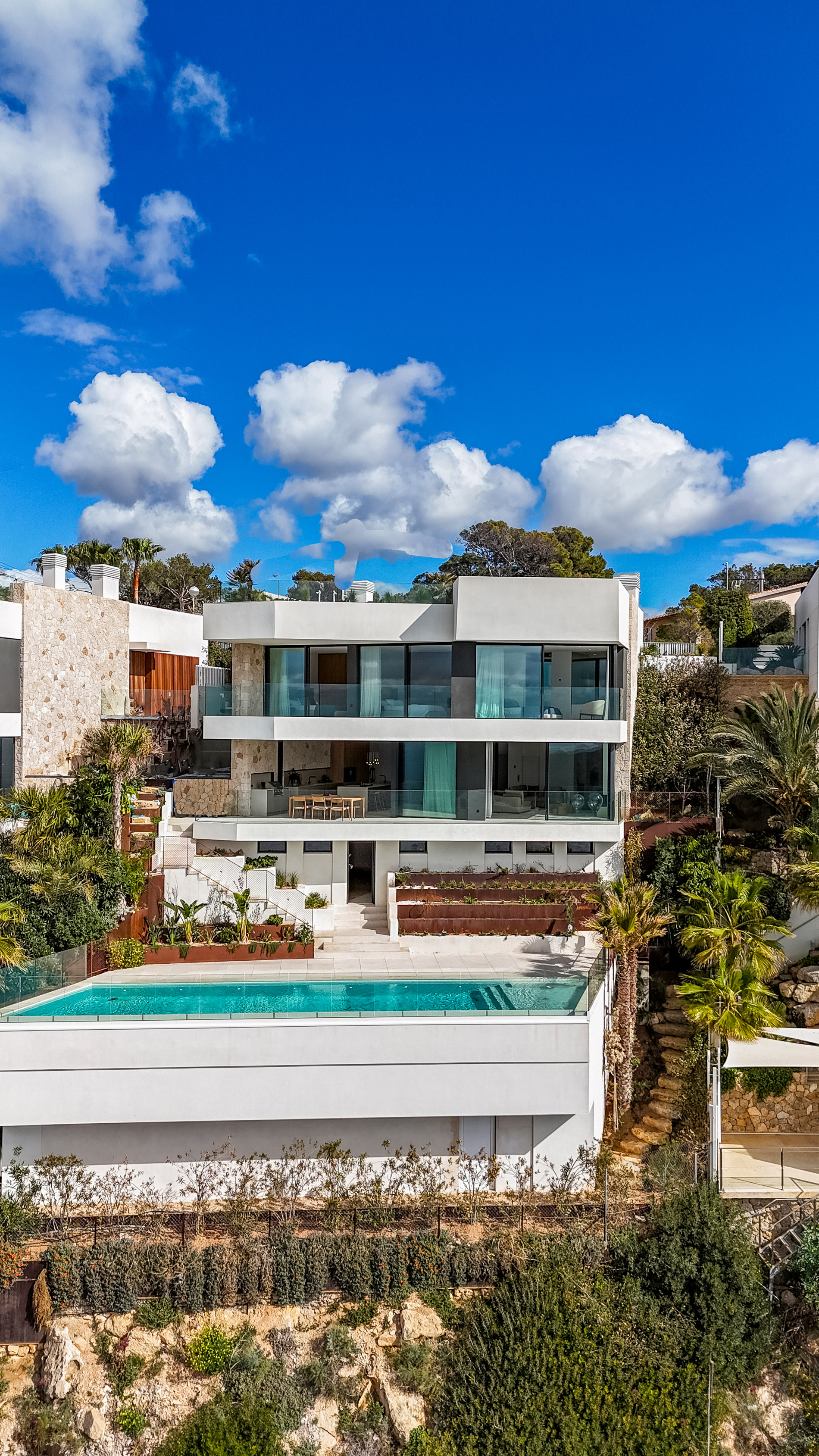 MallorcaSite se enorgullece en presentar una villa de nueva construcción, moderna en El Toro, situado directamente en primera línea de mar con acceso inigualable al mar Mediterráneo y el parque natural de El Toro. Cerca del exclusivo puerto deportivo de Port Adriano, esta propiedad ofrece impresionantes vistas panorámicas al mar, perfectamente integradas en su diseño por un arquitecto de renombre. Impresionante diseño y distribución. La villa presenta una sofisticada estética moderna con líneas limpias y materiales de alta calidad. En la planta superior se encuentran los dormitorios, cada uno con baño en suite y terrazas privadas con vistas al mar. La planta baja consta de un amplio salón-comedor, una cocina totalmente equipada y una bodega, todo ello diseñado para el confort y el entretenimiento. Servicios de lujo. La propiedad incluye una zona de spa, amplias terrazas soleadas y una piscina exterior, proporcionando un amplio espacio para relajarse y disfrutar de las espectaculares vistas. Esta villa en El Toro es más que un hogar; es un estilo de vida. Combinando un diseño moderno, comodidades de lujo y una ubicación privilegiada frente al mar, ofrece lo mejor de la vida costera. Lista para entrar a vivir después de este verano, esta excepcional propiedad espera a sus nuevos propietarios para experimentar el lujo mediterráneo. MallorcaSite, su agencia inmobiliaria en Mallorca, recomienda esta propiedad por su diseño, por las vistas, por su ubicación.