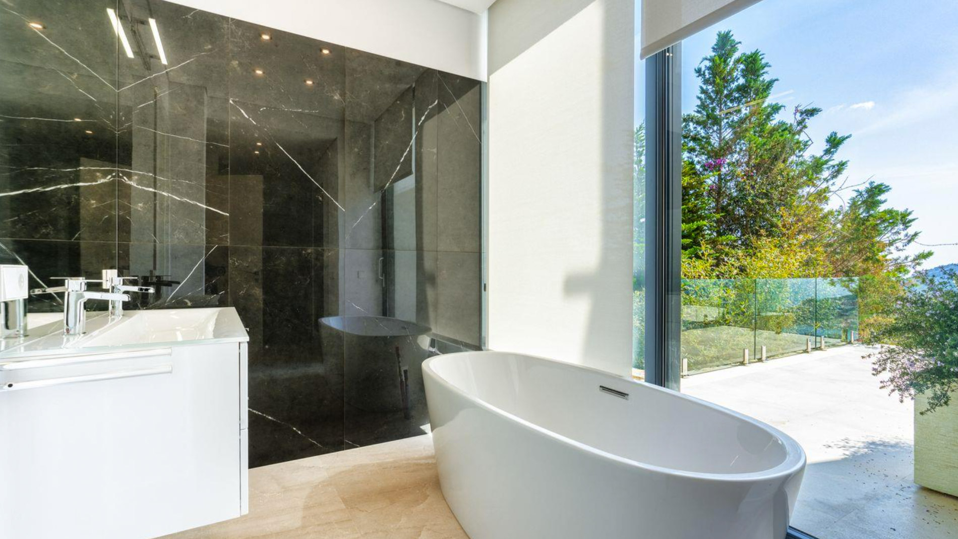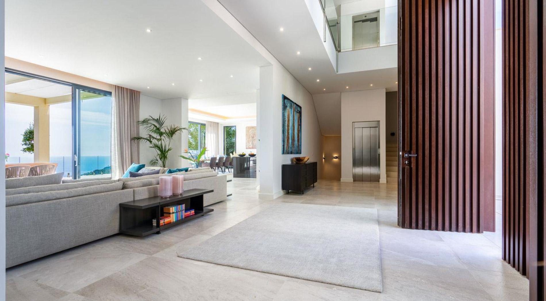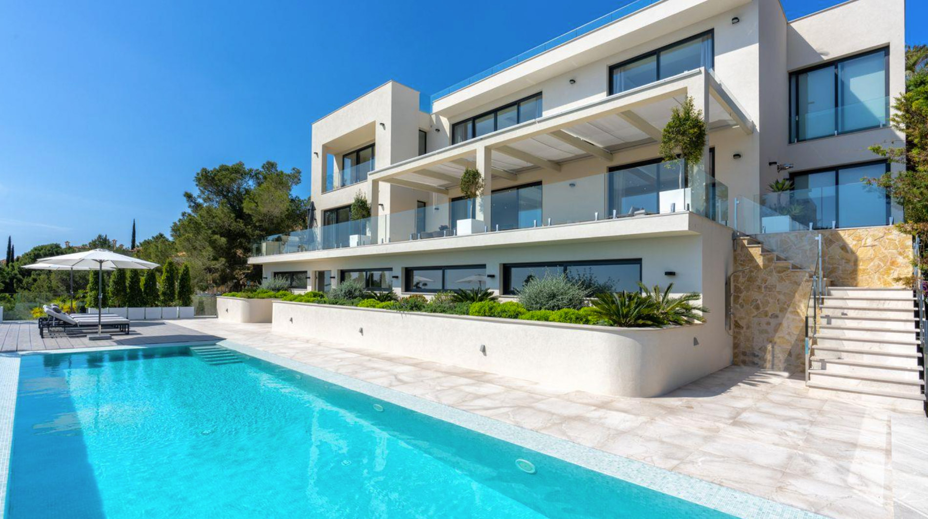La villa ofrece un estilo moderno y los más altos estándares de calidad. Los 800 m2 se distribuyen en 4 niveles, accesibles con ascensor. Además hay una casa para invitados con entrada independiente y dispone de una cocina y 2 dormitorios. En la azotea hay una amplia terraza de 250 m² que es perfecta para disfrutar del sol y de las excelentes vistas panorámicas. El spa ofrece una piscina cubierta climatizada y sauna