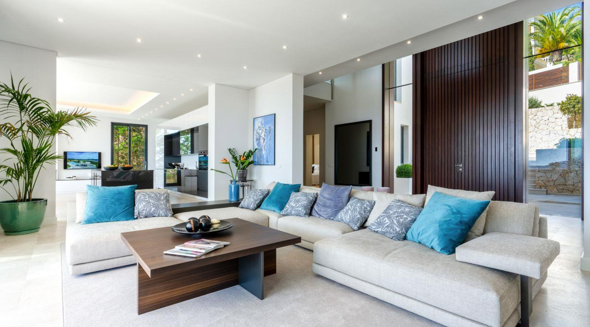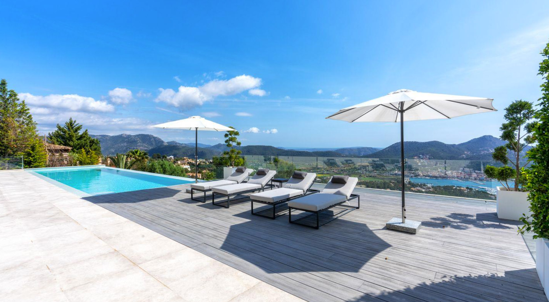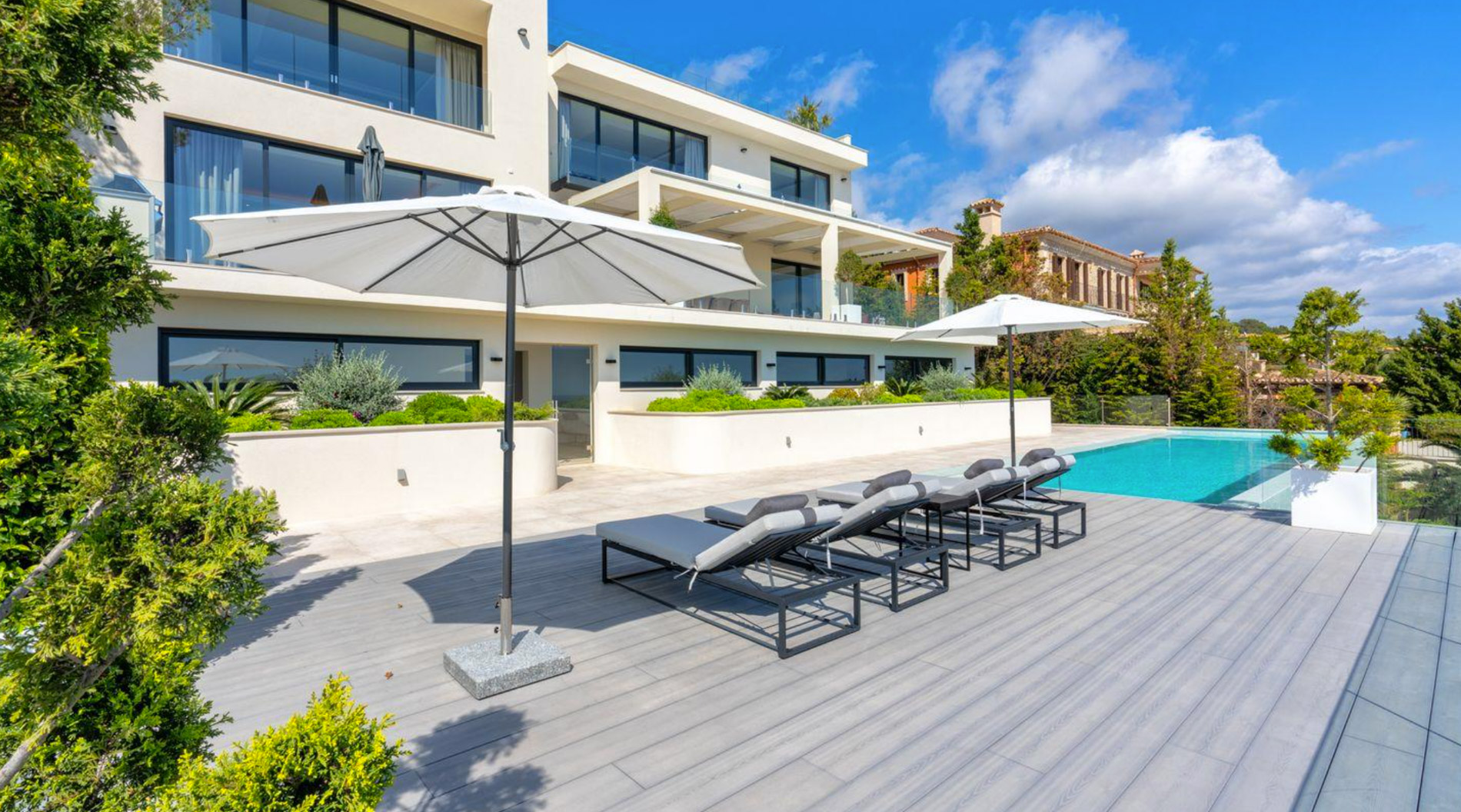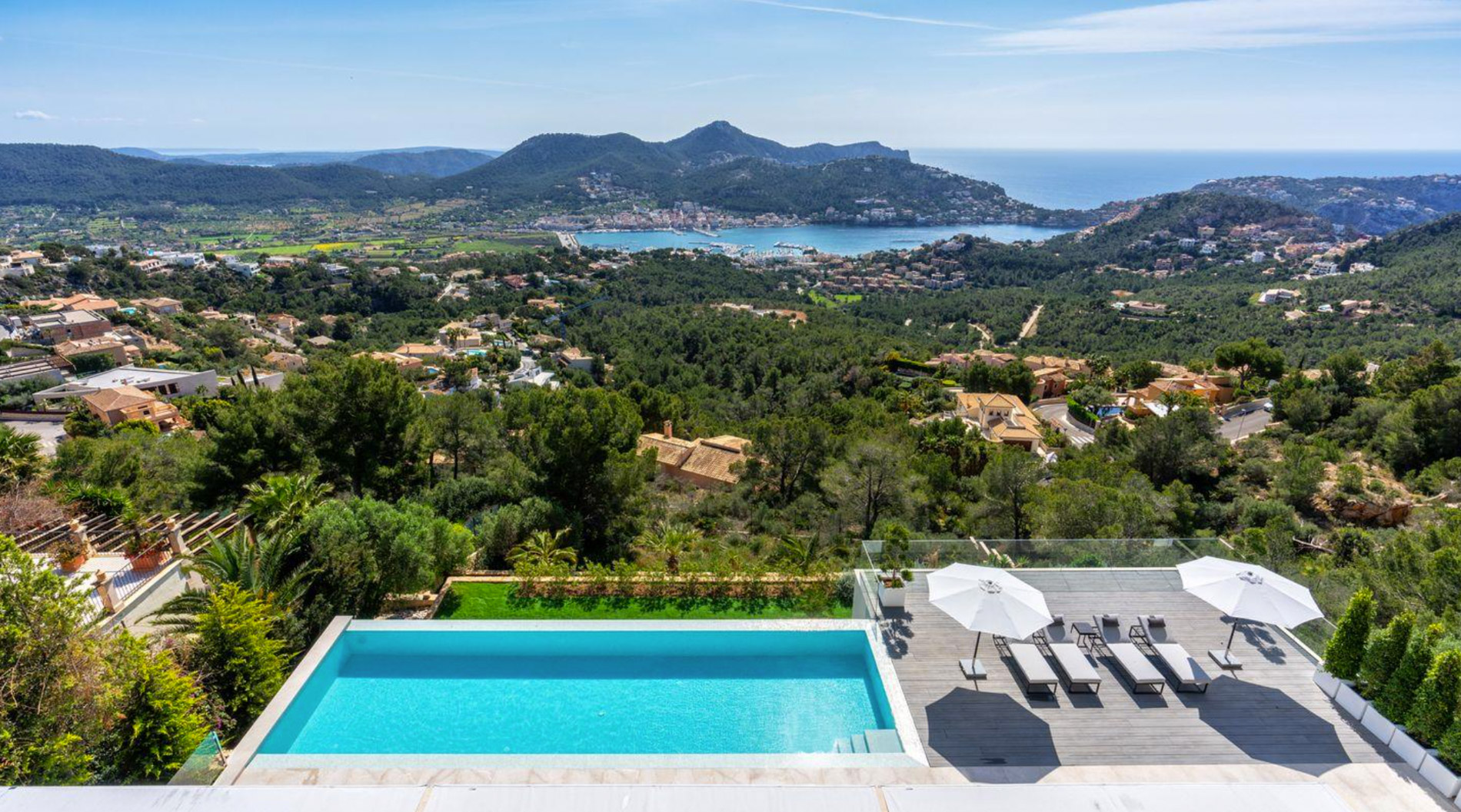 Situada en el exclusivo barrio de Mon Port, esta villa de nueva construcción disfruta de increíbles vistas panorámicas a Palma hasta Ibiza..