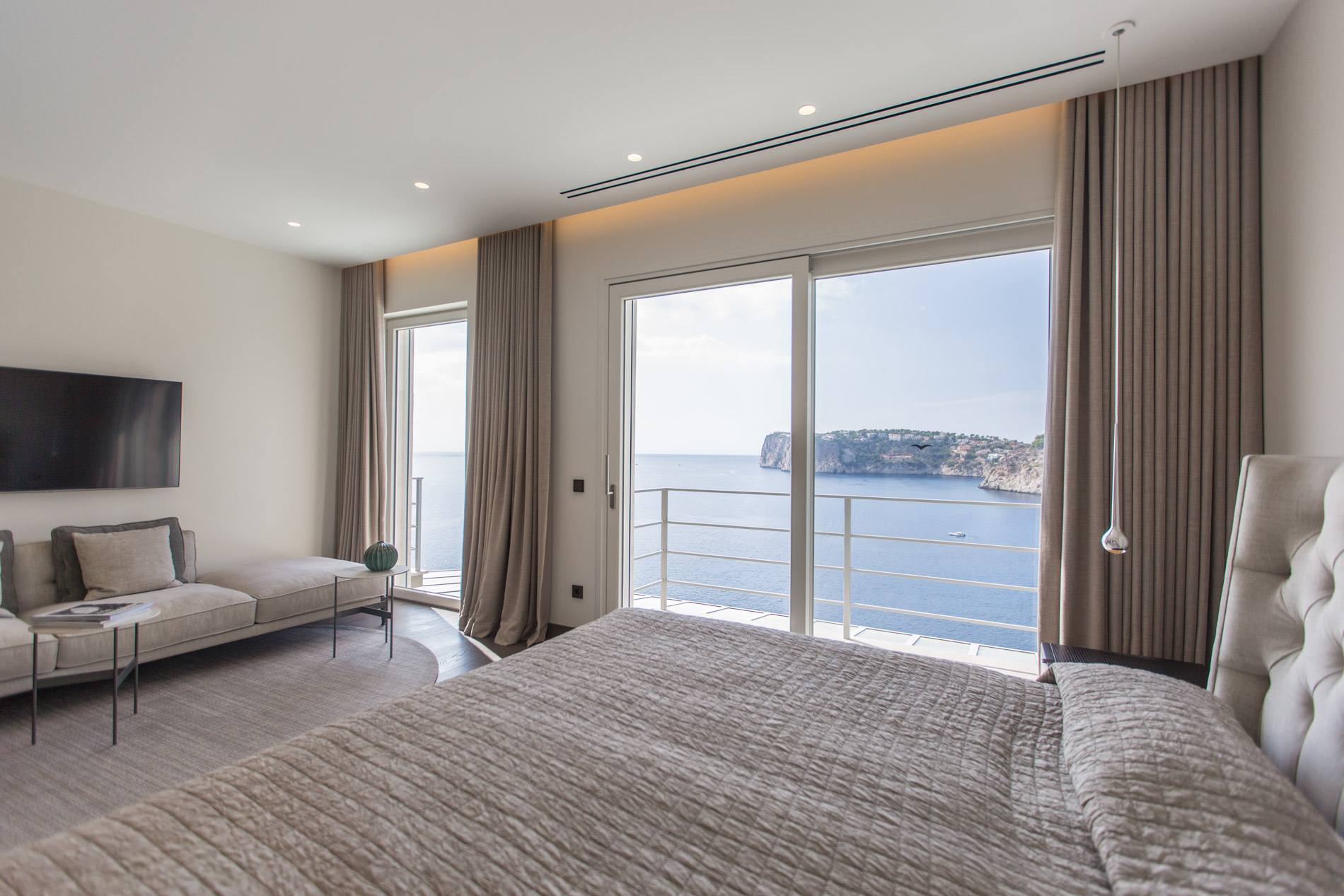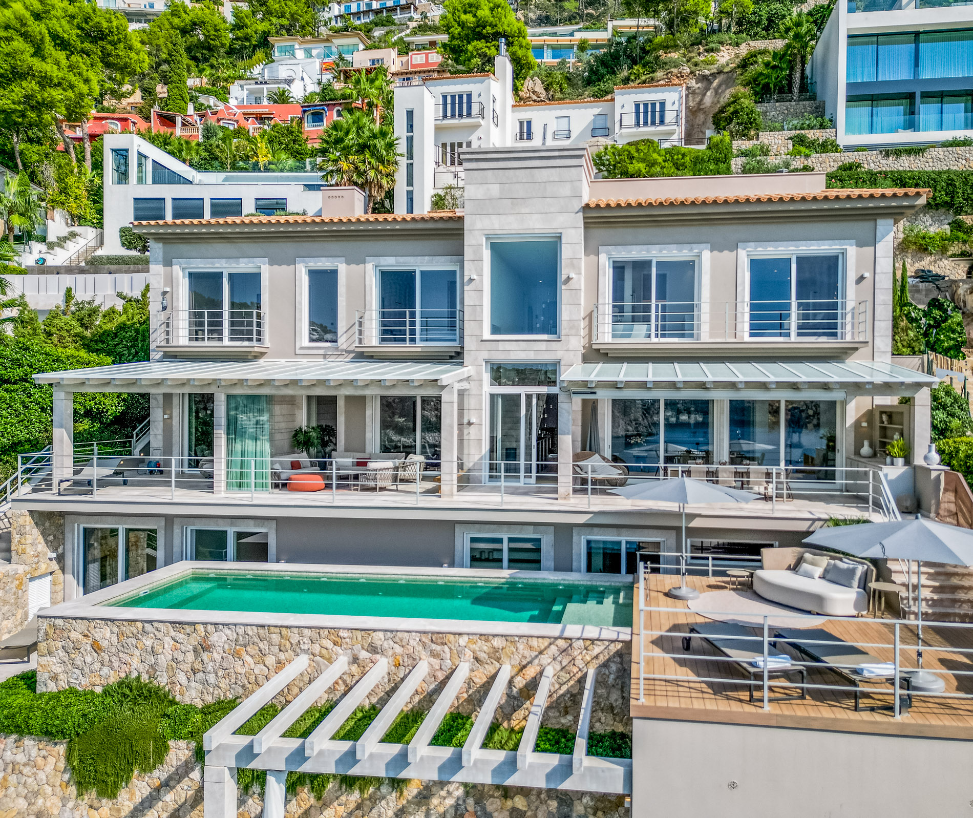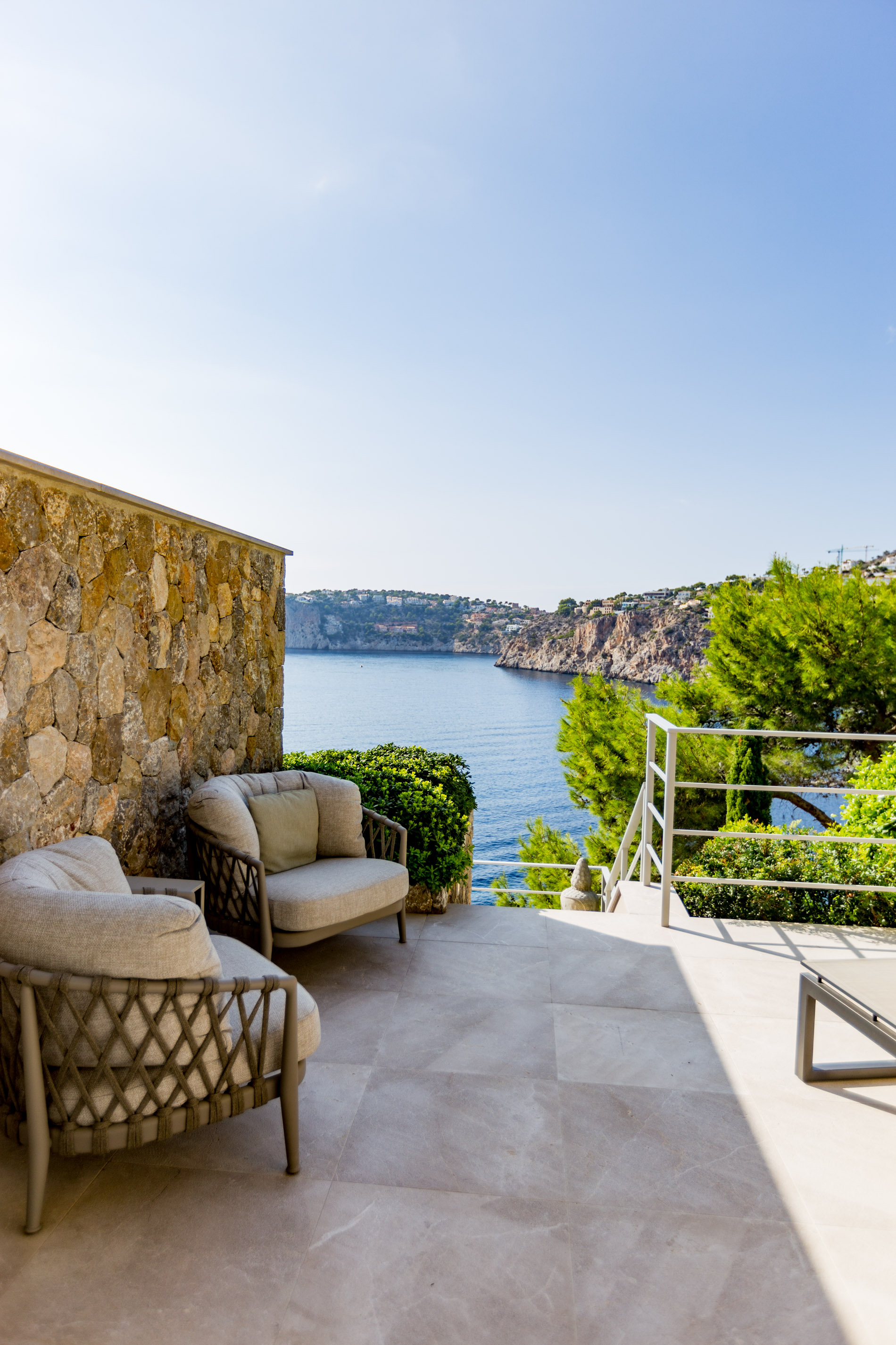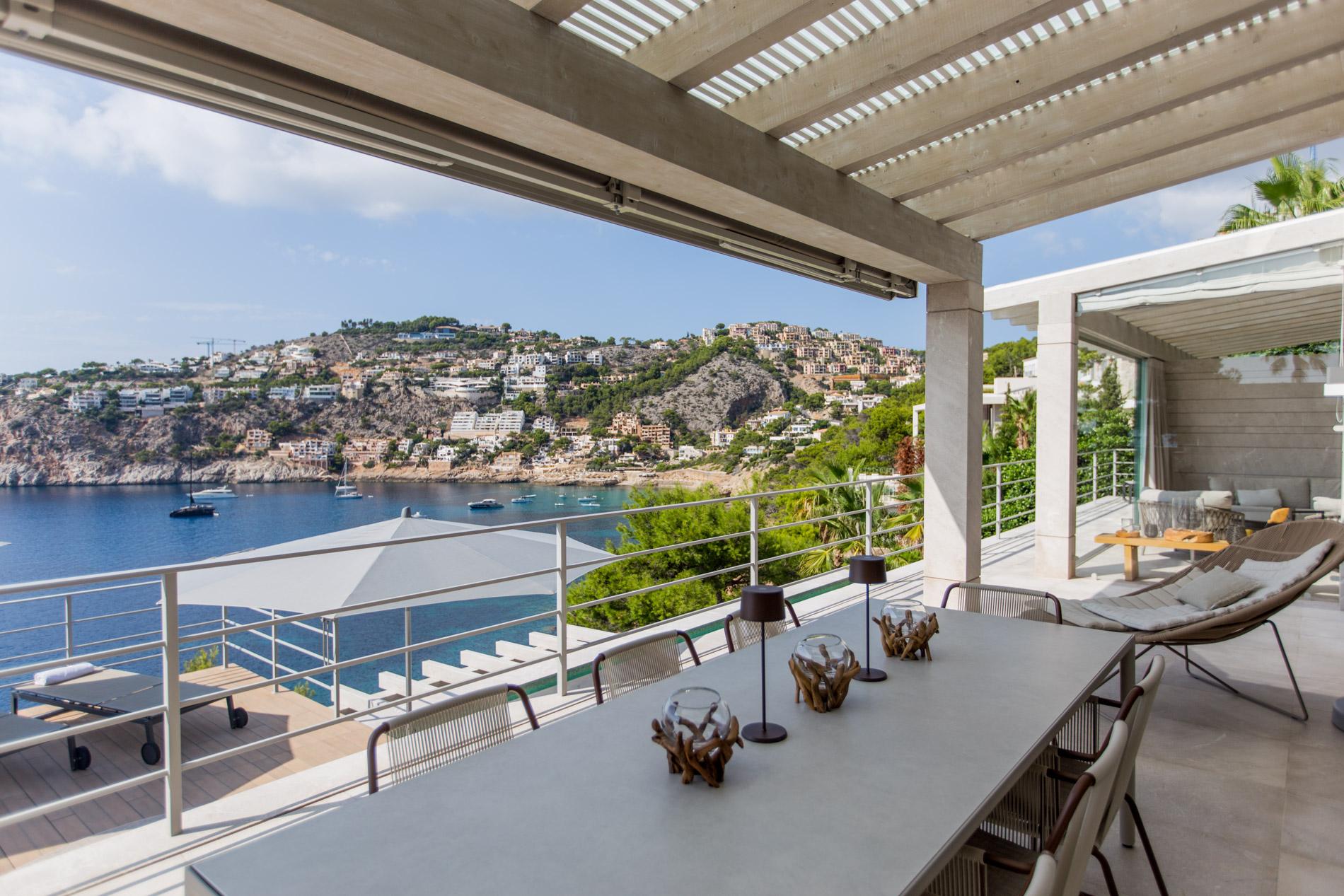 Explorando la Elegancia en Port d'Andratx: Una Villa de Ensueño Ubicada en uno de los lugares más impresionantes de Port d'Andratx, esta propiedad deslumbra con su lujo incomparable y vistas panorámicas que quitan el aliento. Desde majestuosas vistas al mar hasta montañas circundantes y puestas de sol de postal, esta villa ofrece un estilo de vida de ensueño. La villa, que se extiende a lo largo de tres niveles, abarca una generosa superficie construida de 810 metros cuadrados. En la planta superior, dos amplios dormitorios principales con baños en suite y vestidores ofrecen privacidad y comodidad. Un tercer dormitorio con cuarto de ducha completa esta planta, garantizando espacio para toda la familia o invitados. En la planta baja, una cocina espaciosa y exclusiva se fusiona armoniosamente con una elegante sala de estar, creando el escenario perfecto para la vida moderna. Un dormitorio independiente con baño en suite y terraza privada añade un toque de privacidad y comodidad adicional. Desde la cocina y la sala de estar, se accede directamente a terrazas que rodean la zona de la piscina. Aquí, los residentes pueden relajarse y disfrutar de vistas panorámicas inigualables del mar, creando el escenario perfecto para reuniones al aire libre y entretenimiento. El sótano de la villa alberga dos dormitorios adicionales, un baño y una sala de estar adicional con su propia terraza privada. Además, una espaciosa sala de gimnasio completamente equipada brinda la oportunidad de mantenerse activo y en forma sin salir de casa. Una característica destacada de esta propiedad es su cubierta de sauna separada, que ofrece la posibilidad de una sesión de sauna relajante con vistas al mar, una experiencia verdaderamente única. Los materiales de alta calidad, como la piedra natural y el parquet de roble, infunden a la villa una sensación cálida y acogedora. La exclusividad y calidad se elevan aún más con muebles de primer nivel de marcas como January, B&B Italia, Flexform, Freifrau, Poliform, Minotti y Tribu. En resumen, esta propiedad en Port d'Andratx es una obra maestra de lujo y diseño, donde la elegancia se combina con vistas impresionantes para crear un estilo de vida excepcional en la hermosa costa de Mallorca. Es una invitación a vivir la vida en su máxima.