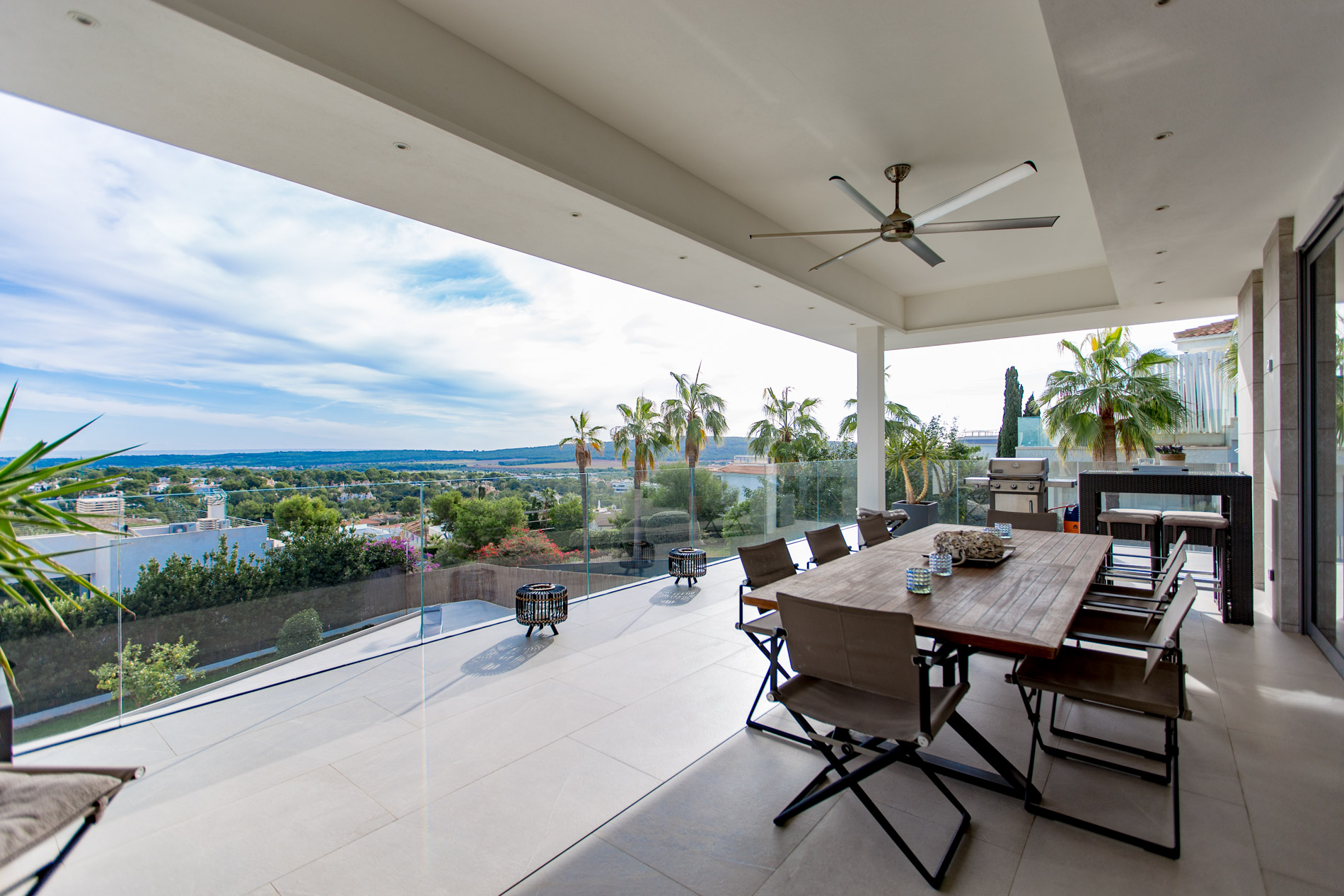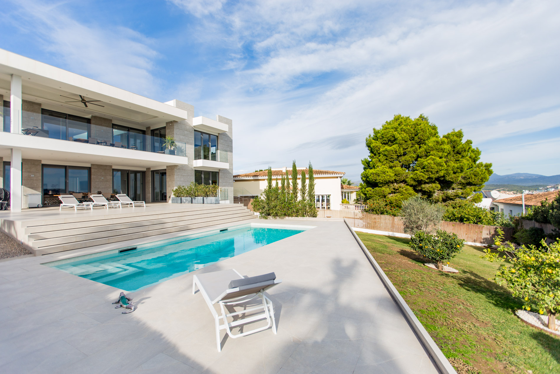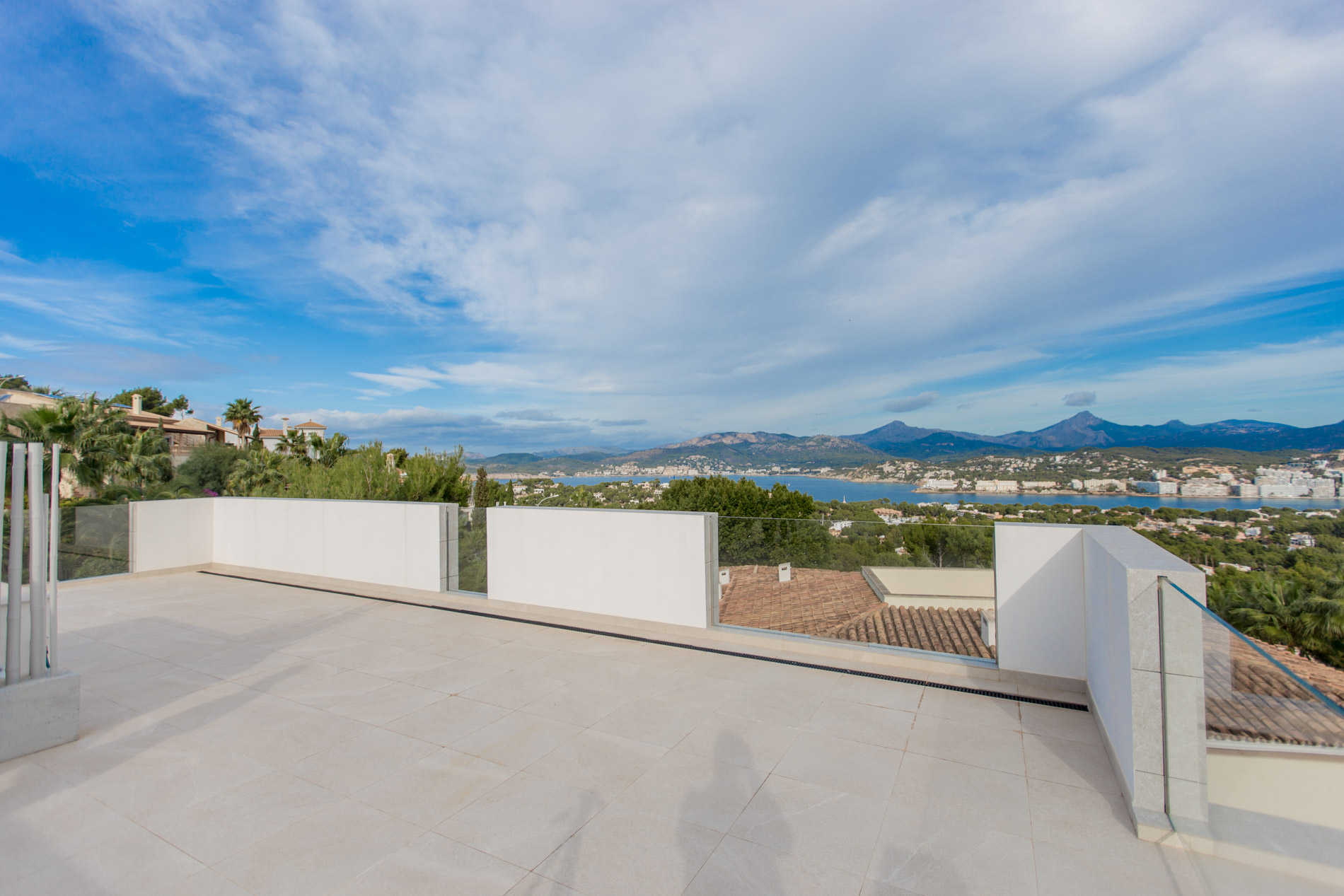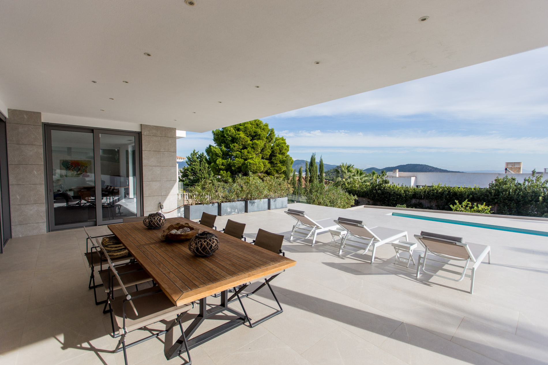 Esta moderna villa de reciente construcción fue diseñada por el renombrado arquitecto mallorquín Alejandro Palomino, cuenta con una fantástica vista panorámica al mar, tanto a la Bahía de Santa Ponsa como hacia la isla de El Toro. La villa se encuentra en la parte alta de Nova Santa Ponsa, en una zona muy tranquila y privada.