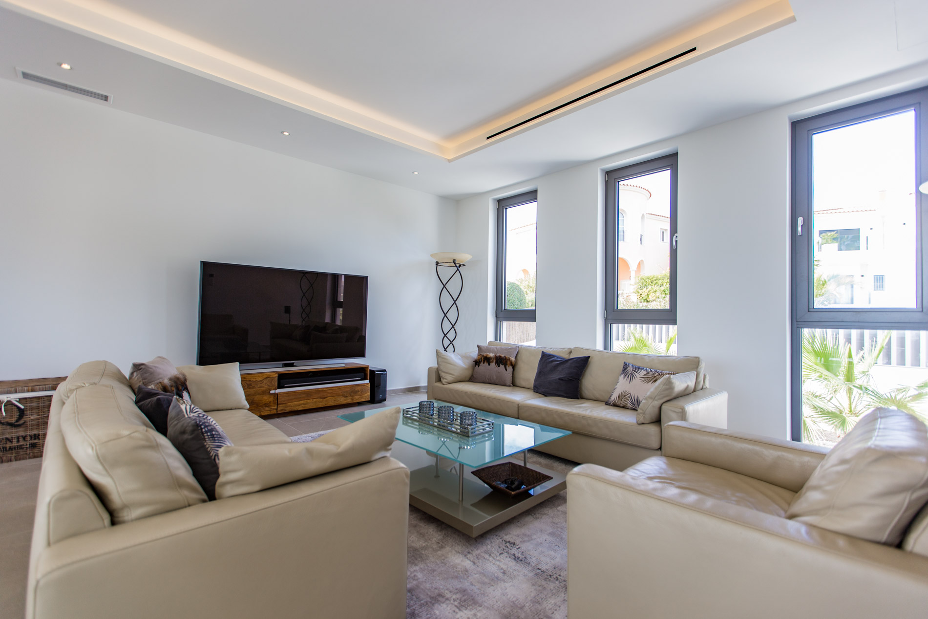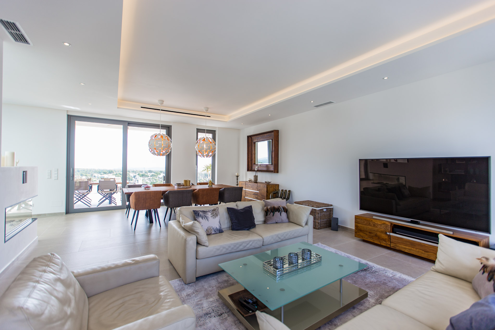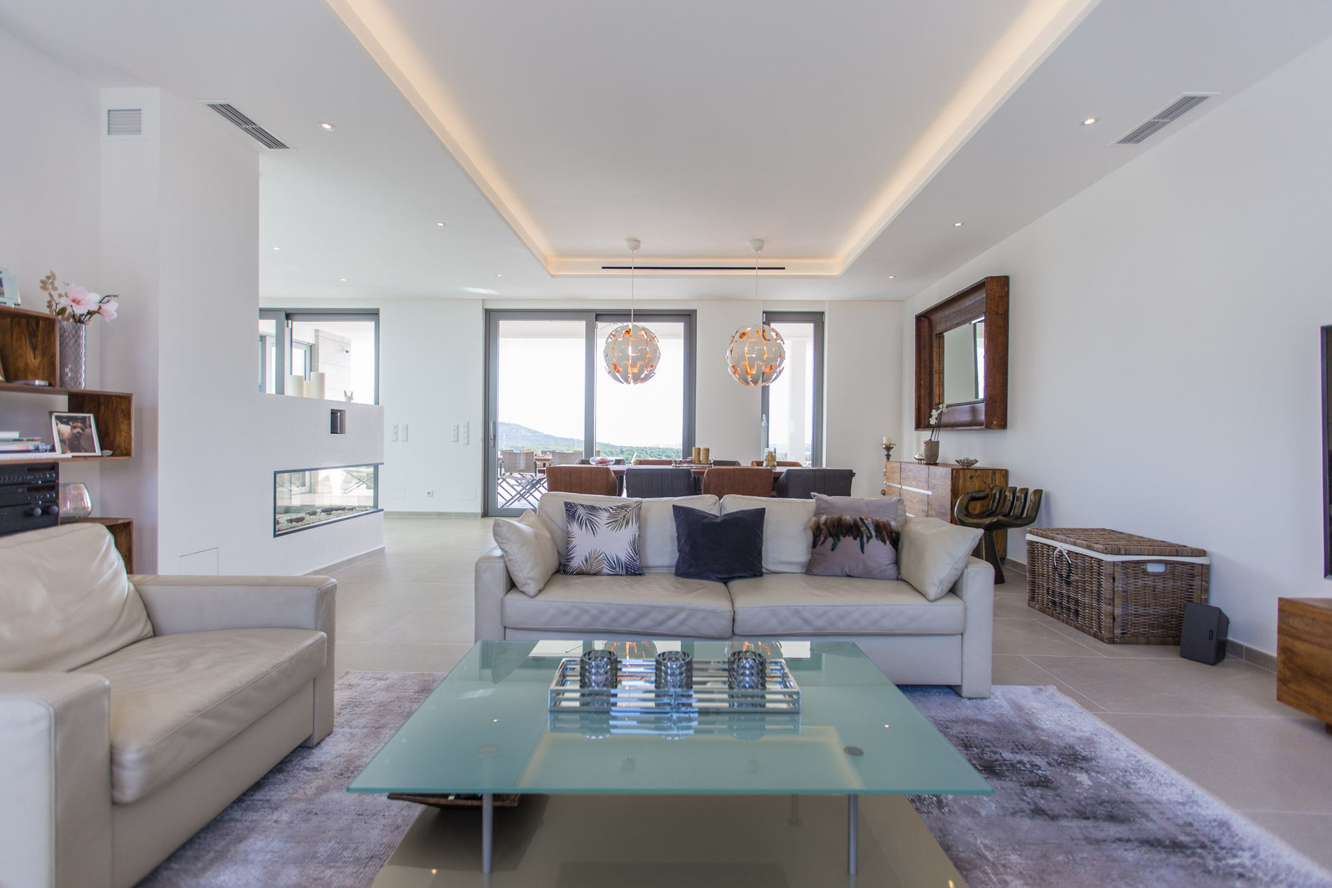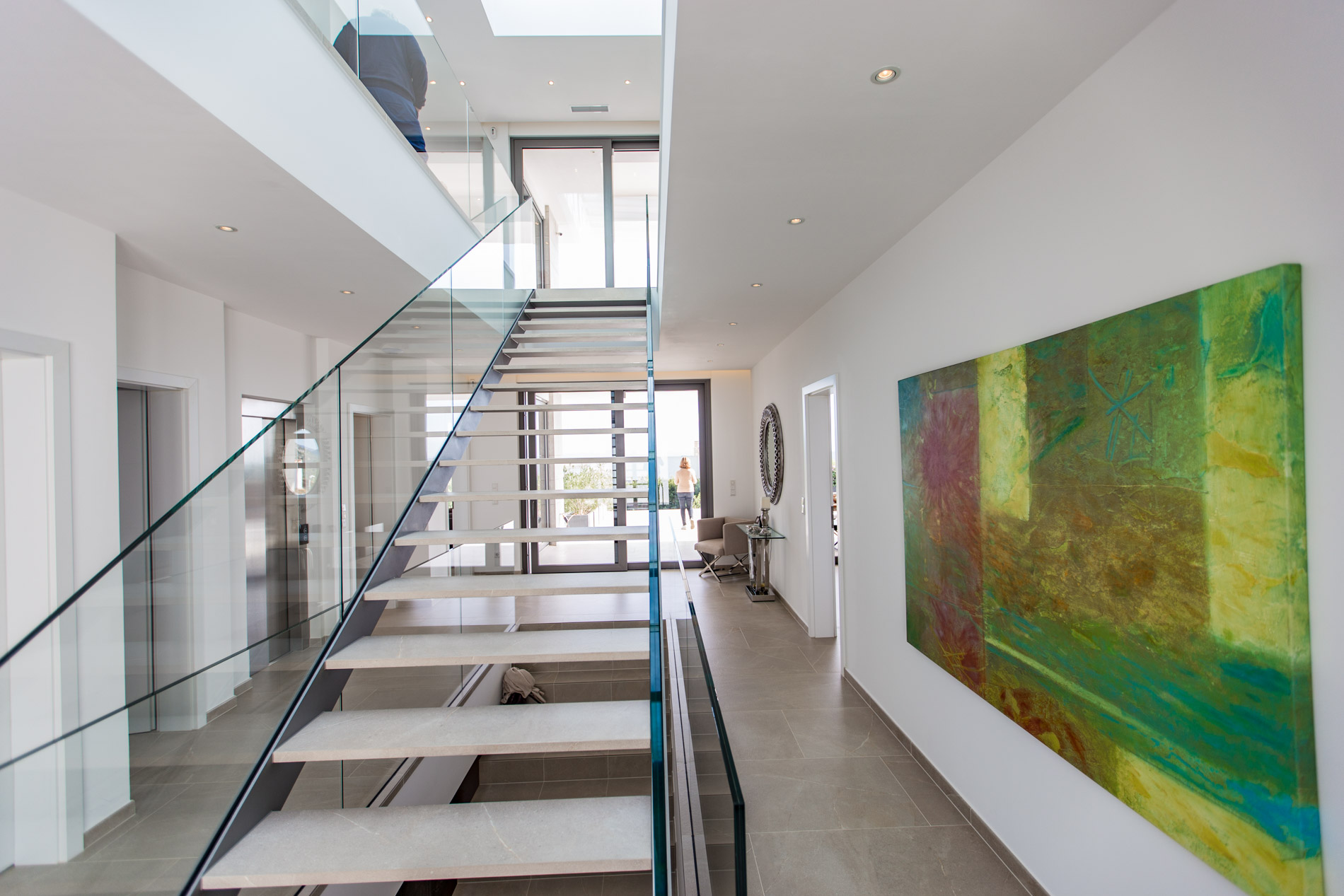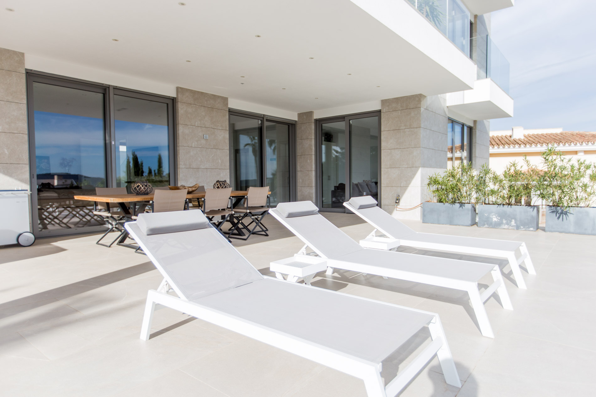 Esta moderna villa de reciente construcción fue diseñada por el renombrado arquitecto mallorquín Alejandro Palomino, cuenta con una fantástica vista panorámica al mar, tanto a la Bahía de Santa Ponsa como hacia la isla de El Toro. La villa se encuentra en la parte alta de Nova Santa Ponsa, en una zona muy tranquila y privada.