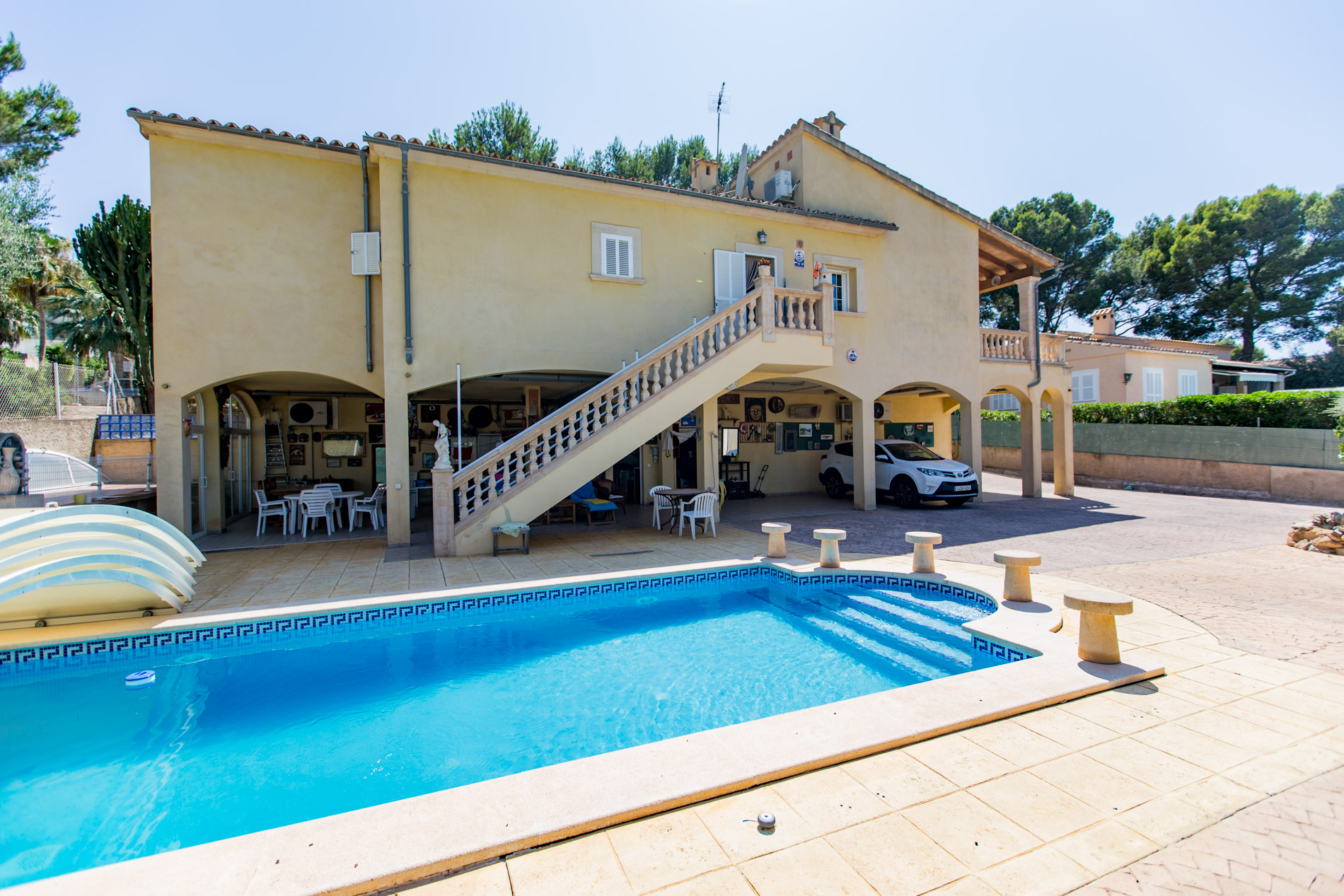 En el corazón de una de las zonas más codiciadas de Santa Ponsa, a escasos minutos a pie de la playa, del elegante puerto deportivo y del conocido campo de golf, se encuentra este encantador chalet, un oasis de tranquilidad y estilo mediterráneo en una parcela de 900 m². Rodeado de vegetación y con una atmósfera serena, ofrece el equilibrio perfecto entre privacidad, comodidad y una ubicación estratégica. La casa cuenta con aproximadamente 250 m² construidos distribuidos en tres dormitorios y tres baños, con espacios amplios, luminosos y funcionales. El salón principal se abre directamente a una soleada terraza orientada al suroeste, donde las tardes se llenan de luz y las puestas de sol se convierten en protagonistas del día. El jardín acoge una piscina, ideal para disfrutar del clima privilegiado de Mallorca durante todo el año. Entre sus múltiples espacios exteriores, destacan una amplia terraza cubierta de 100 m² en la planta inferior, perfecta para relajarse a la sombra, y otras dos terrazas con orientación suroeste que permiten disfrutar del sol hasta última hora del día. La propiedad ofrece también varias plazas de aparcamiento en el exterior. Además, el inmueble presenta interesantes posibilidades de ampliación: la planta superior podría transformarse en un dormitorio adicional, una oficina o incluso un estudio independiente. También existe la opción de construir una nueva habitación o un apartamento para invitados. Esta propiedad representa una oportunidad única para quienes buscan una residencia con carácter, rodeada de naturaleza, pero con todos los servicios de Santa Ponsa al alcance de la mano. Ya sea como hogar permanente, refugio vacacional o inversión con potencial, este chalet reúne todos los ingredientes para enamorar a primera vista. MallorcaSite, su agencia inmobiliaria en Mallorca, recomienda esta propiedad por su ubicación y sus posibilidades de ser reformada.
