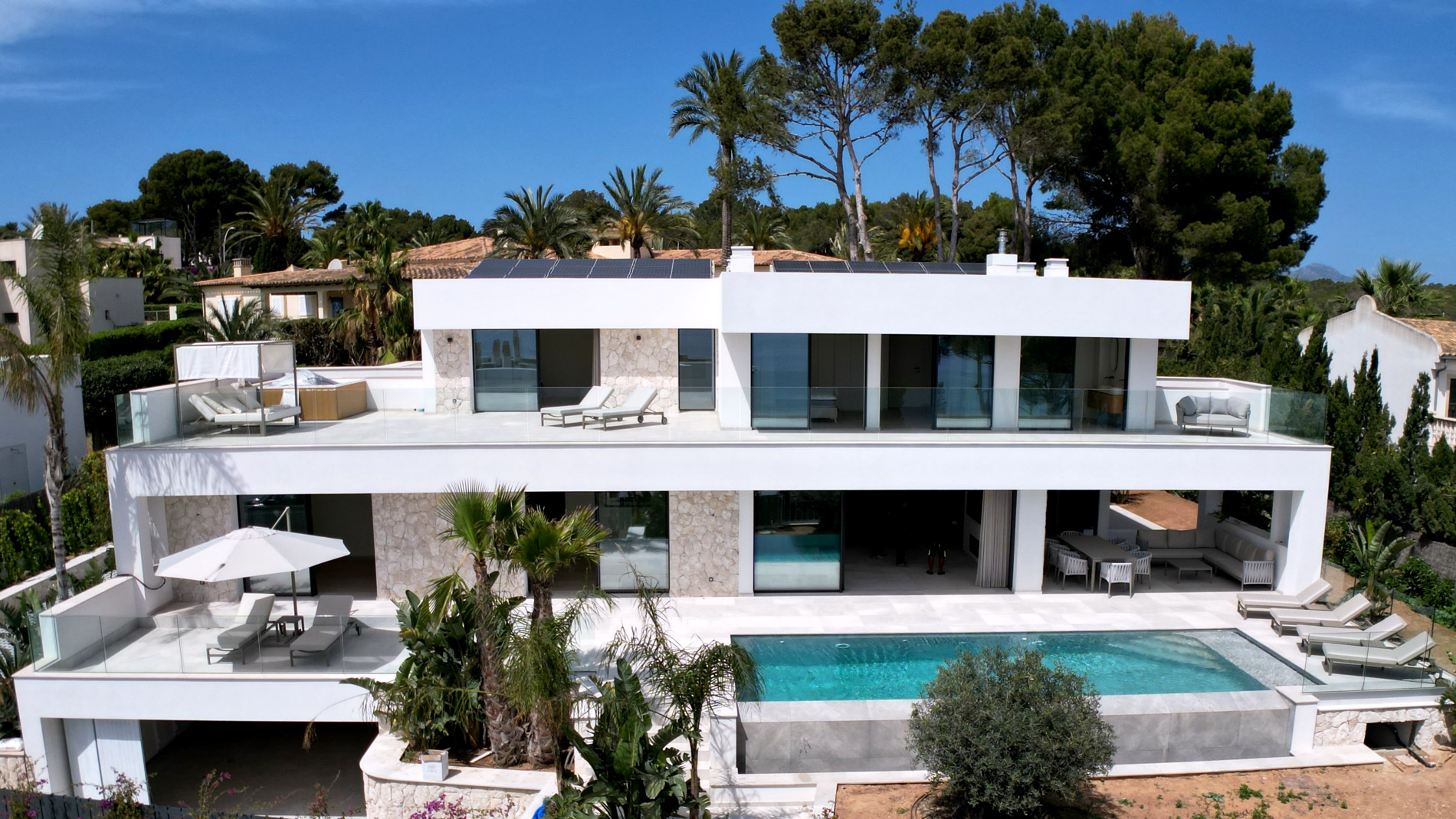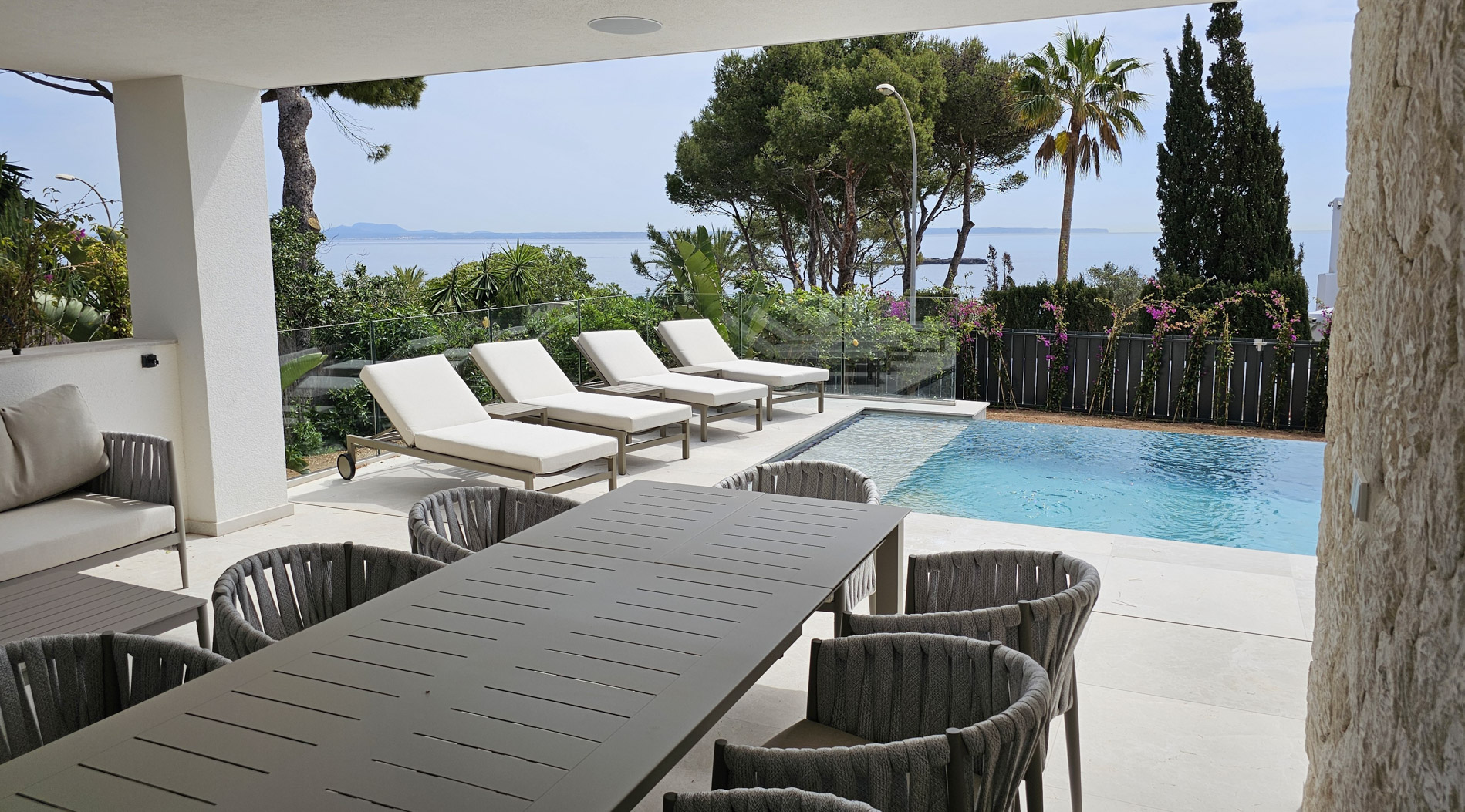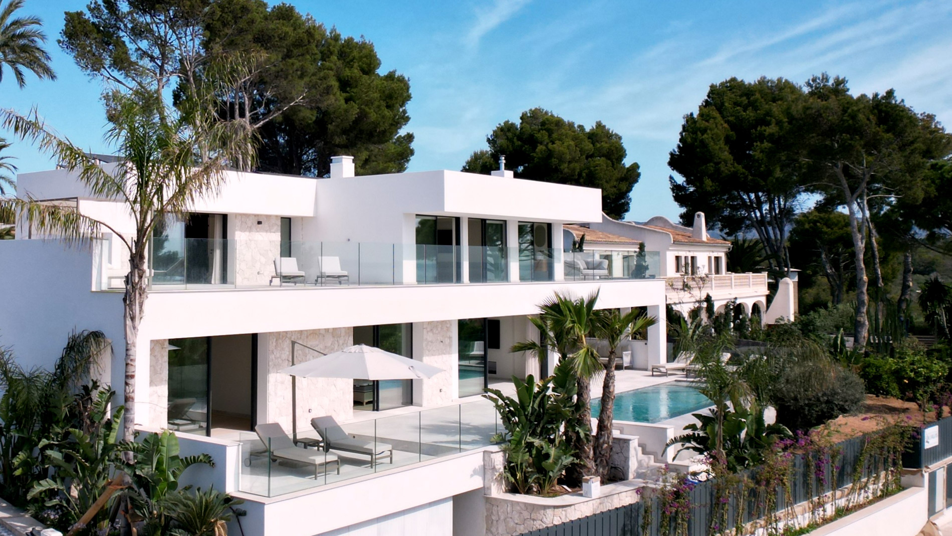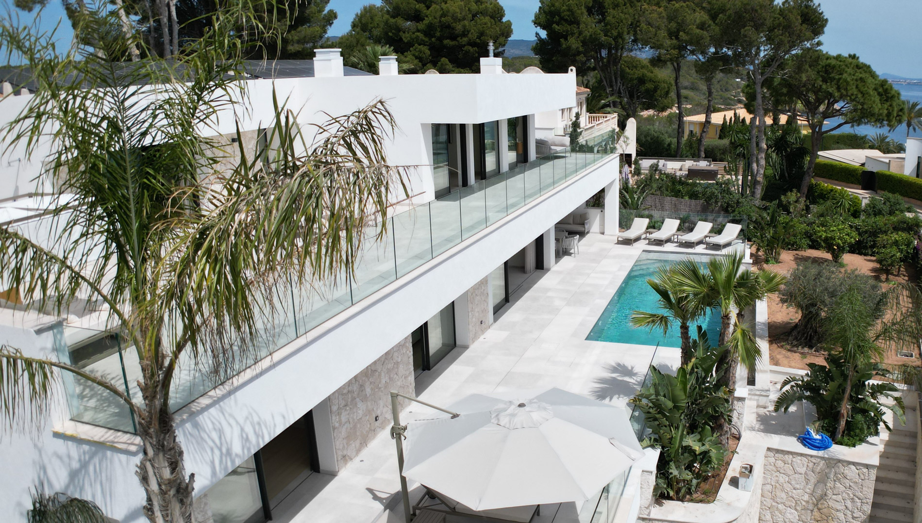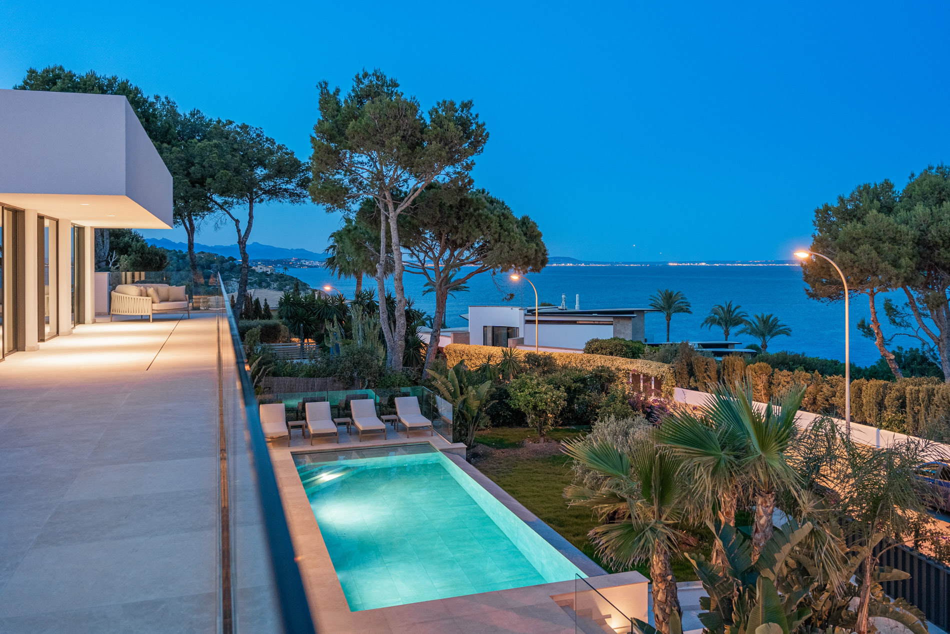 Esta lujosa villa combina a la perfección el encanto histórico con la elegancia moderna. Originalmente construida para Pilar de Borbón, hermana del antiguo rey español Juan Carlos, esta exquisita residencia mediterránea ofrece una historia de esplendor real junto con todas las comodidades de la vida contemporánea. Los escudos originales de la familia real española todavía adornan la entrada, recordando su distinguido linaje. Ubicada en una segunda línea privilegiada junto al mar, esta propiedad orientada al sur ofrece vistas impresionantes al mar desde todas las habitaciones. La parcela, llana y tranquila, garantiza una excelente privacidad y un ambiente sereno. Construida recientemente, la villa incorpora las últimas tecnologías de eficiencia energética. Esto incluye un sistema de control inteligente del hogar, una bomba de calor de fuente de aire moderna, calefacción por suelo radiante controlable individualmente, un potente sistema de aire acondicionado, una piscina de agua salada climatizada con cubierta solar y un amplio sistema fotovoltaico que cubre gran parte de las necesidades energéticas de la villa. El uso de materiales de alta calidad como piedra natural y suelos de parqué de roble, junto con una cocina de diseño lujoso de Espacio equipada con electrodomésticos Gaggenau, resalta la exclusividad de esta propiedad. Ofrece amplias zonas de estar que se extienden sobre extensas terrazas, el jardín y la zona de la piscina, desde donde se puede admirar el mar azul celeste. Además, cuenta con un garaje doble y plazas de aparcamiento exteriores adicionales en la parcela, proporcionando un amplio espacio de estacionamiento. Mallorcasite, su agencia inmobiliaria en Mallorca, recomienda encarecidamente esta propiedad por su ubicación, excelentes calidades y vistas impresionantes.