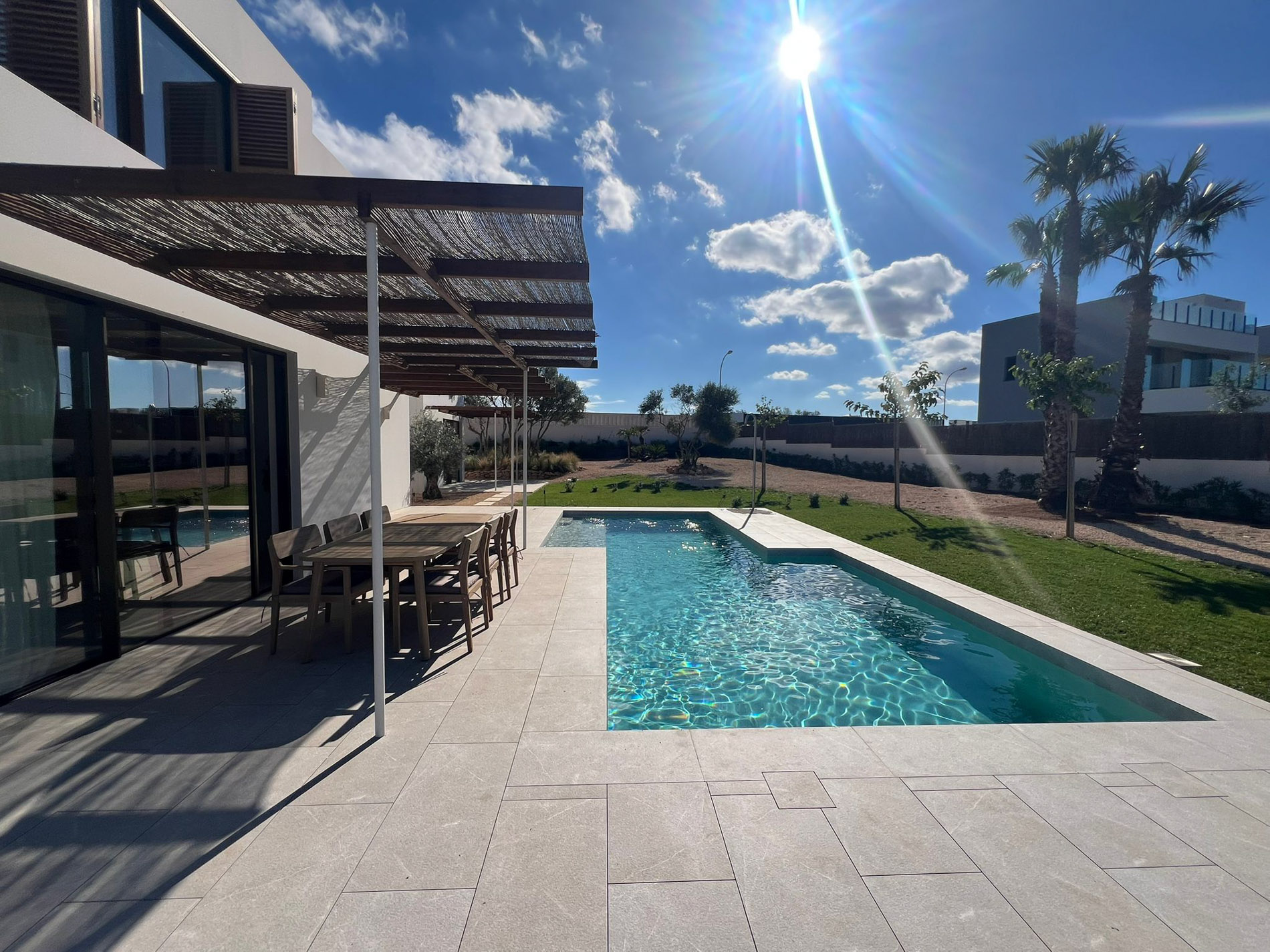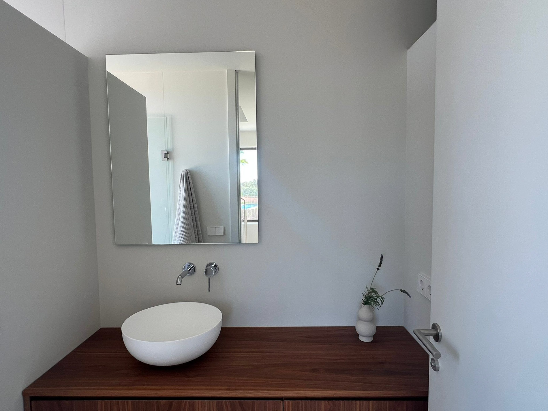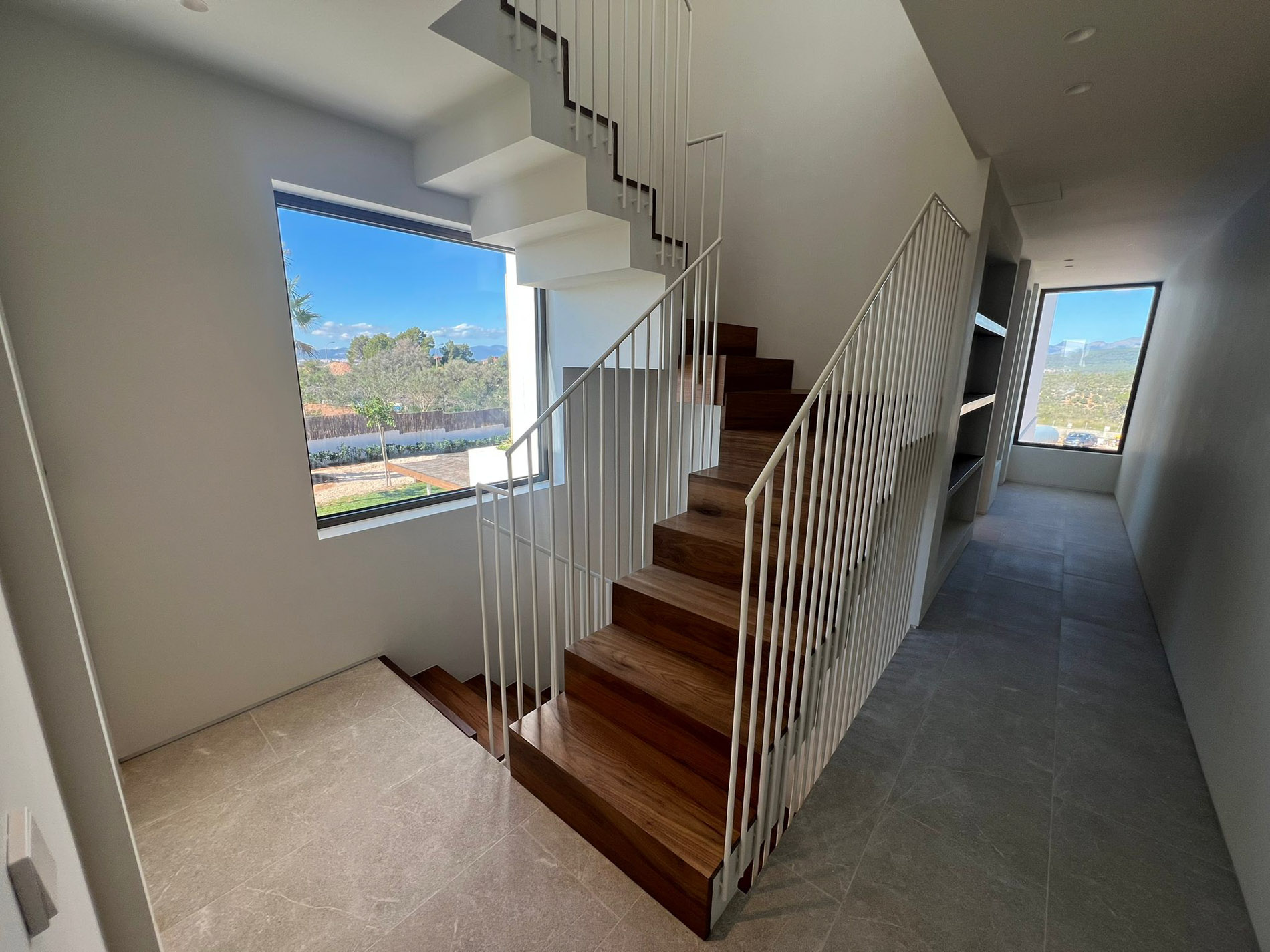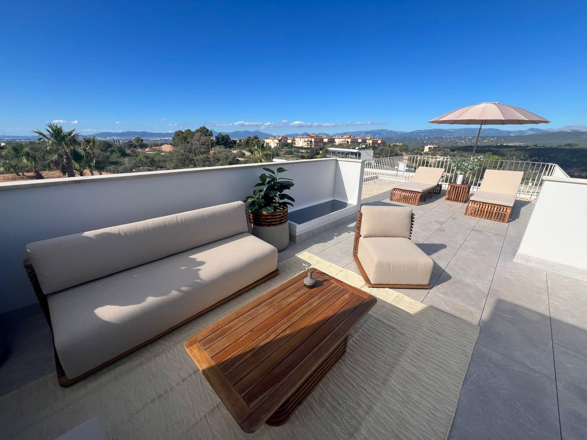 En Son Gual II, donde el paisaje se abre en suaves ondulaciones y la luz mallorquina lo abraza todo, surge una vivienda contemporánea que reinterpreta el nuevo mediterráneo desde la calma, la simplicidad y la belleza de los materiales nobles. La arquitectura juega con volúmenes puros y líneas limpias, mientras las carpinterías en bronce mate y los muros de hormigón aportan solidez, carácter y una estética atemporal. En el interior, la vivienda despliega una continuidad serena: un pavimento porcelánico en tonos tierra unifica estancias y terrazas, las puertas de suelo a techo liberan la verticalidad de los espacios y los armarios integrados de diseño minimalista aportan orden y discreción. Cada detalle —desde los rodapiés ocultos hasta los muebles de obra en tonos crema— contribuye a un ambiente cálido, luminoso y profundamente mediterráneo. La conexión con el exterior se siente en cada rincón. Las pérgolas de estructura metálica rematadas en cañizo dibujan sombras suaves que invitan a vivir el clima de la isla durante todo el año. El jardín combina césped, vegetación aromática y arbolado cuidadosamente seleccionado, creando un paisaje natural que acompaña la arquitectura sin competir con ella. La piscina, revestida en porcelánico antislip en tono tierra, se convierte en un espejo tranquilo donde el entorno se refleja. En cuanto al equipamiento, la vivienda ofrece un nivel de confort contemporáneo: cocina completamente equipada con Miele, lavadero independiente, baños de diseño con microcemento, ascensor que conecta todas las plantas, climatización sectorizada, suelo radiante por aerotermia y paneles fotovoltaicos que optimizan la eficiencia energética. Una casa pensada para disfrutar, para habitar sin prisa y con la certeza de que cada elemento ha sido elegido con intención. MallorcaSite recomienda esta propiedad por su arquitectura mediterránea contemporánea, su cuidado por los materiales y su perfecta integración con el paisaje.