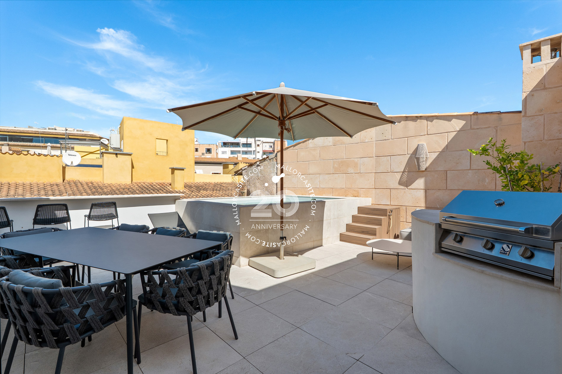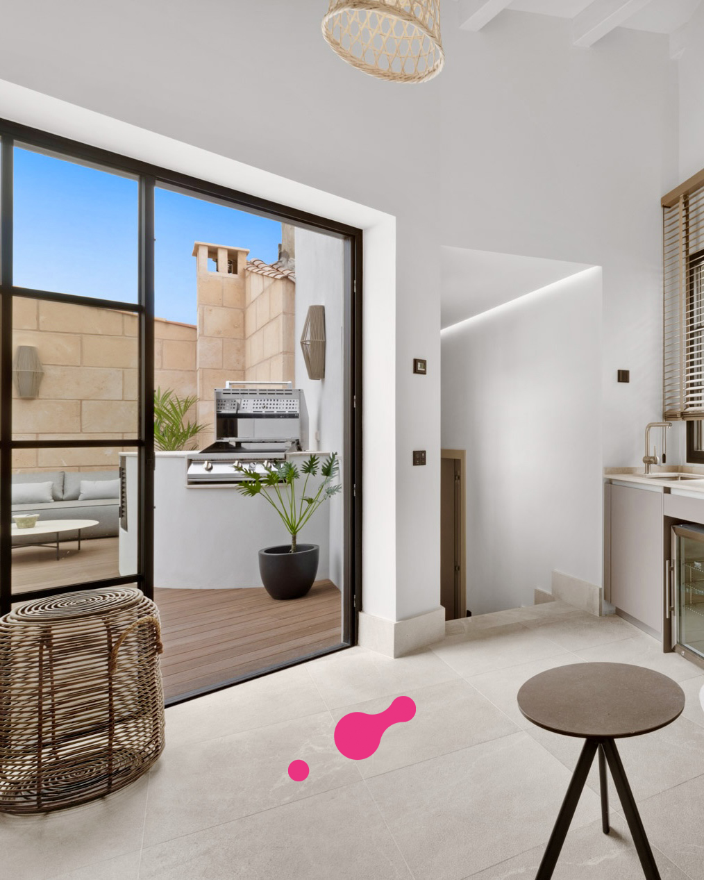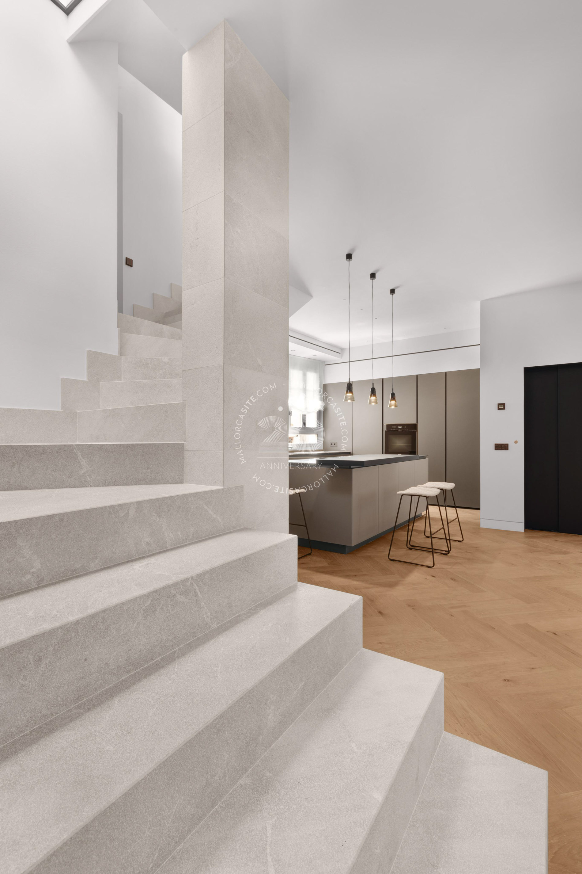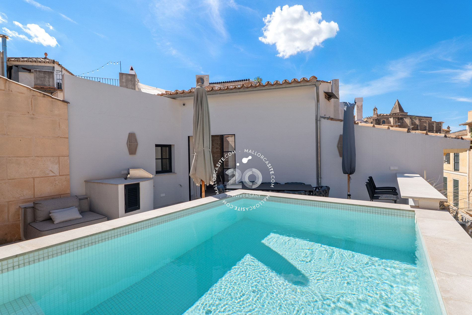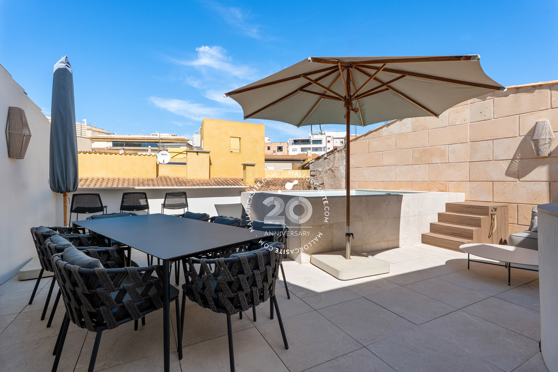 Esta vivienda ofrece tres plantas más una azotea y una bodega. En la planta baja, encontrara el garaje y la elegante entrada con paneles de madera. Desde aquí, puede subir por la elegante y auténtica escalera o por el ascensor hasta saón en la segunda planta, que crea un ambiente impresionante con techos altos. Una cocina moderna de Varenna (Poliform) con isla forma el corazón de este salón. Los acabados estan hechas a medida de madera con piedra natural fina y una moderna chimenea de gas en el salón proporcionan un ambiente acogedor y un toque individual. Un piso mas arriba está la azotea con piscina. Para las horas relajadas hay una zona de barbacoa y una pequeña cocina con nevera, superficie de trabajo y fregadero. Debajo de la terraza de la azotea se encuentra la amplia suite de invitados con baño y vestidor. El dormitorio principal con su propio salón se encuentra en el 1er piso y tiene acceso directo al ascensor que conecta todos los niveles de la propiedad. La elegante suite, que impresiona con techos altos de 3,5 metros, establece nuevas tendencias en estilo. Las molduras ORAC en las paredes, un baño con tocador y un área húmeda. La suite ofrece una pequeña sala de estar con sofá y mesa de maquillaje para las damas. El elegante vestidor (hecho en Italia) seguramente entusiasmará a los propietarios. Otra habitación de invitados con baño en suite también se encuentra en esta planta. Enfrente de su puerta encontrara el mejor barrio del casco antiguo, el antiguo mercado de pescado (La Lonja), el lujoso puerto de Palma y el paseo marítimo (Paseo Marítimo). Incluso el moderno mercado de Santa Catalina se encuentra a solo 5 minutos a pie.